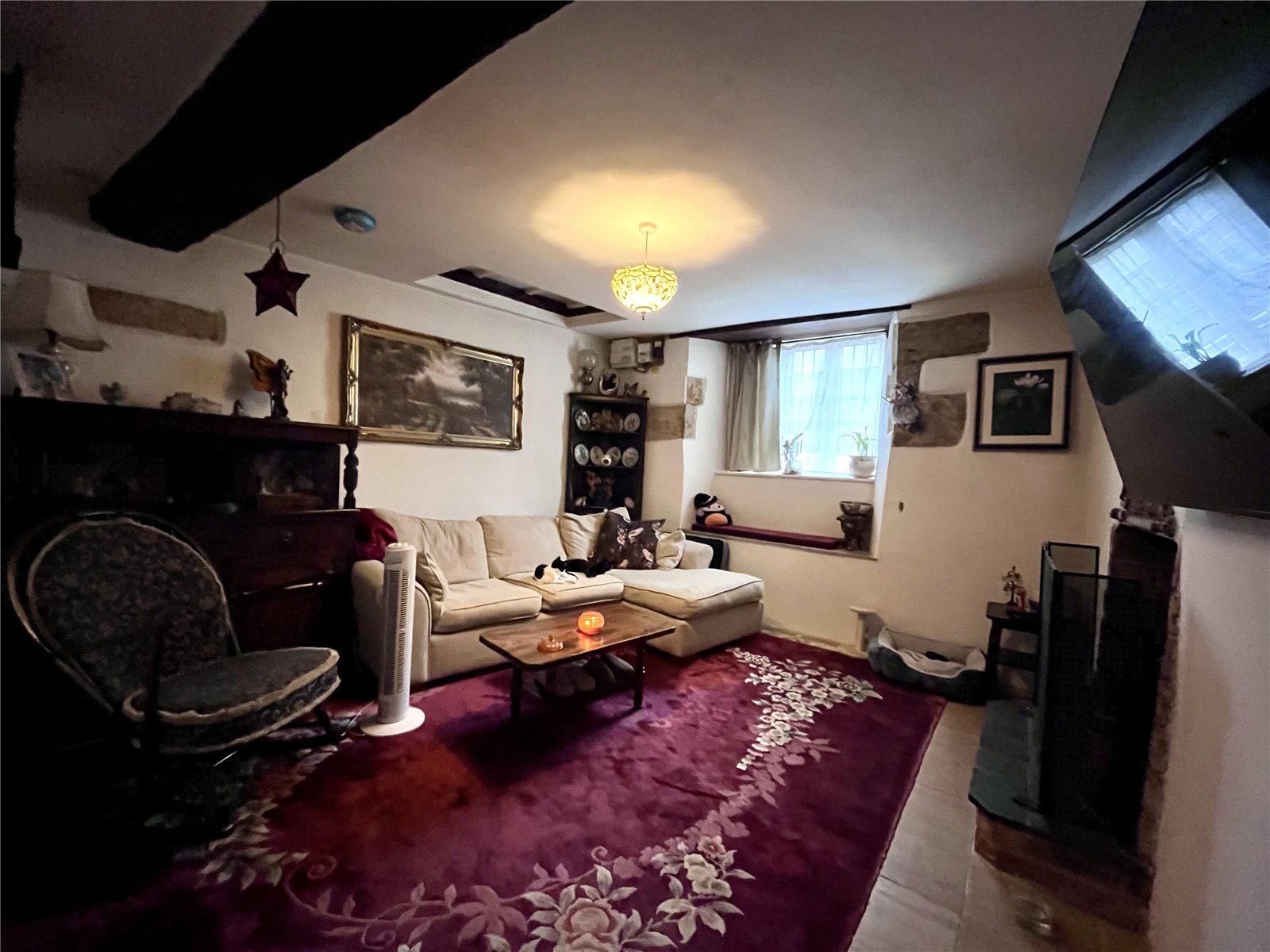 Lounge 13'2" x 12'6" (4.01m x 3.8m). The main focal point of the room is the large open fireplace set on brick hearth with brick and stone surround, window to front aspect with window seat under and exposed stonework to sides, exposed beams, television point and telephone point.