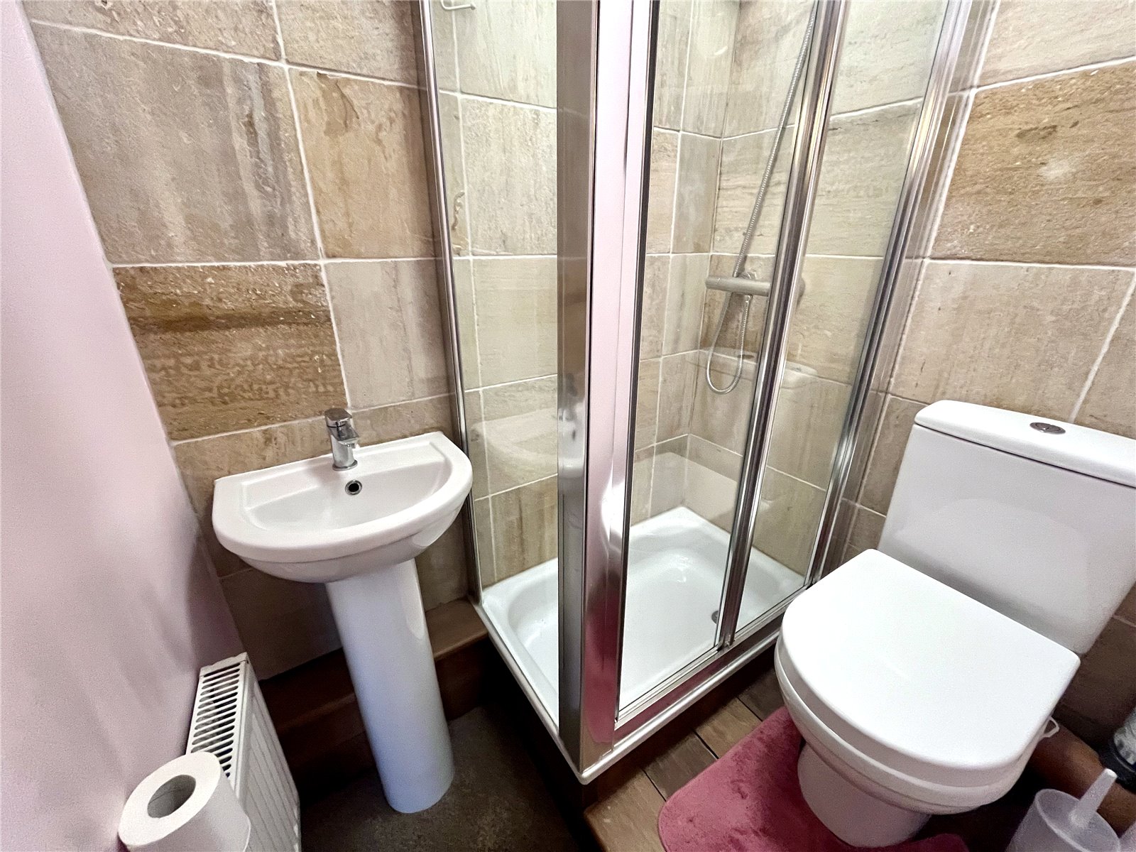 Ensuite Fitted with a three piece suite comprising of fully enclosed, fully tiled shower cubicle, pedestal wash hand basin and low level WC. Fully tiled walls, single panel radiator and exposed wooden floorboards.