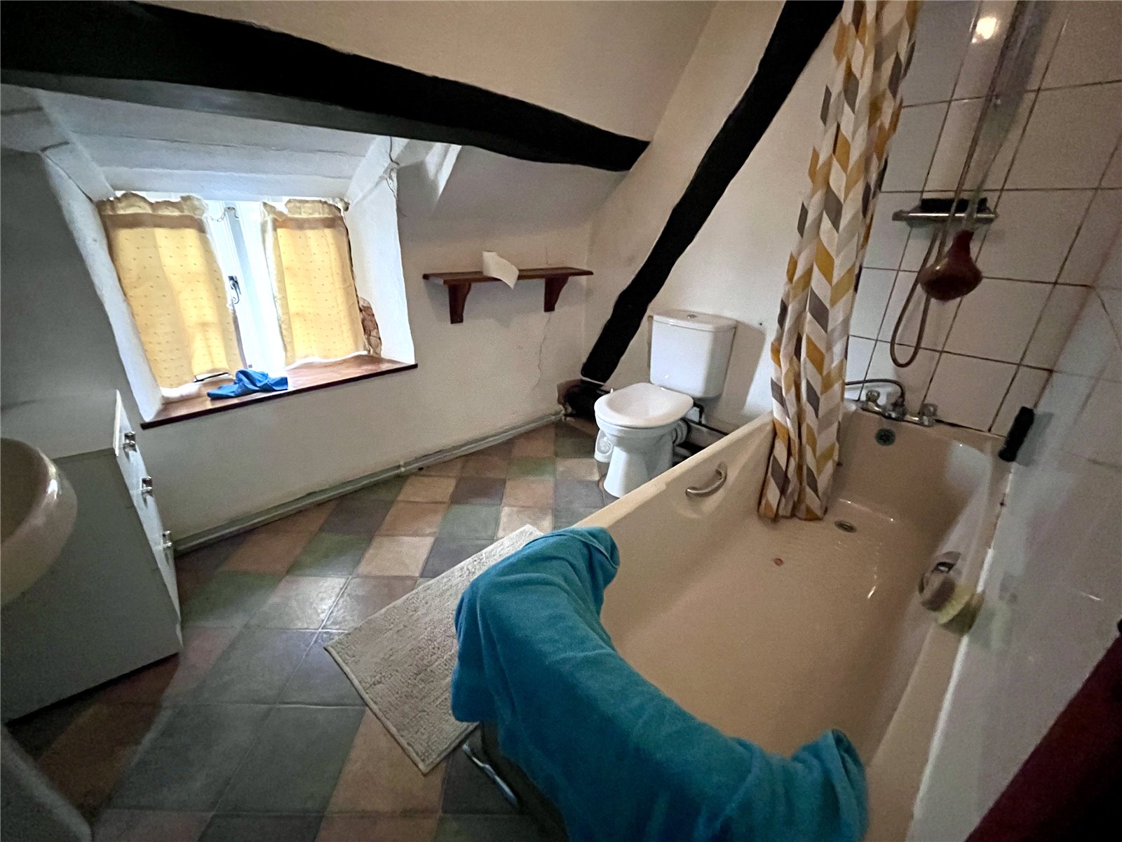 Bathroom 8'8" x 7' (2.64m x 2.13m). Fitted with a three piece suite comprising of low level WC, wash hand basin with tiled splashback and panel bath with mixer taps and shower attachment, exposed beams, vinyl flooring, window to rear aspect with deep sill.