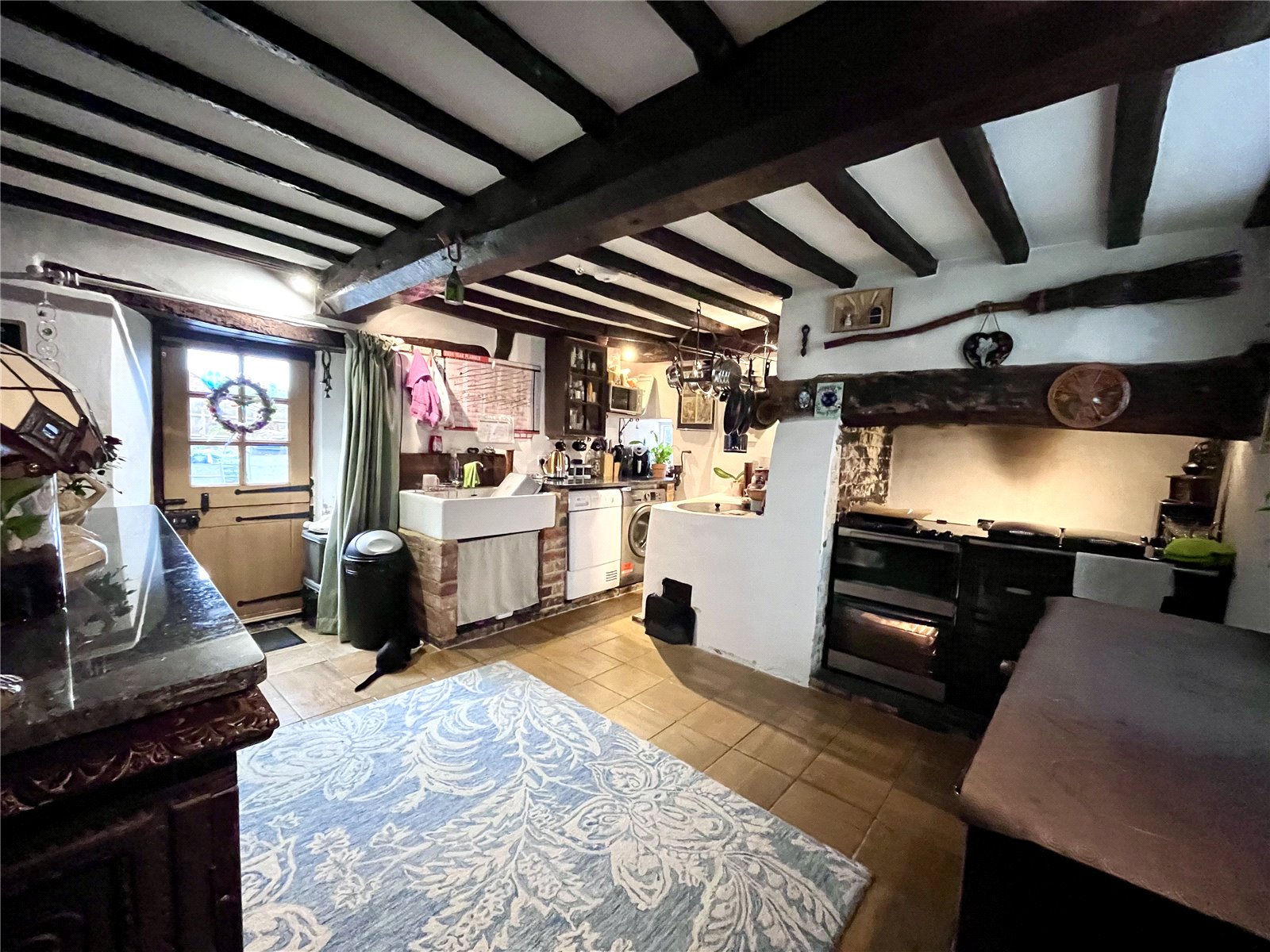 Kitchen 17'10" x 12'6" (5.44m x 3.8m). Fitted with a brick built plinth with large ceramic sink over and space for dishwasher under, Original copper in one corner with, large opening for fireplace affording ample room for a range style cooker with exposed beam over, window to both side and rear aspect and hardwood stable door to rear, tiled floor, exposed beams to ceiling and opening to stairs rising to first floor in one corner of the room
