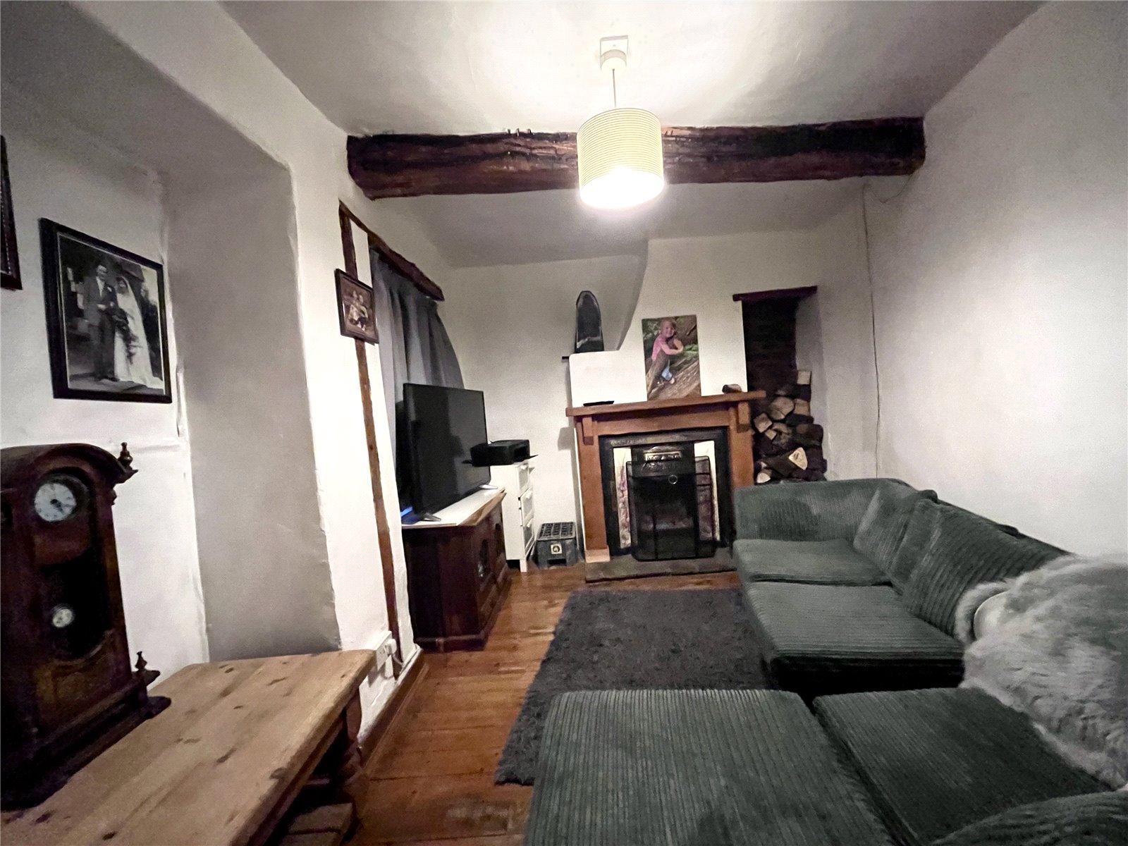 Lounge 14'1" x 9' (4.3m x 2.74m). Exposed floorboards, Georgian pane window to front aspect, opening for fireplace with wooden surround and mantle with cupboards and shelves either side, exposed ceiling beam, opening to: -