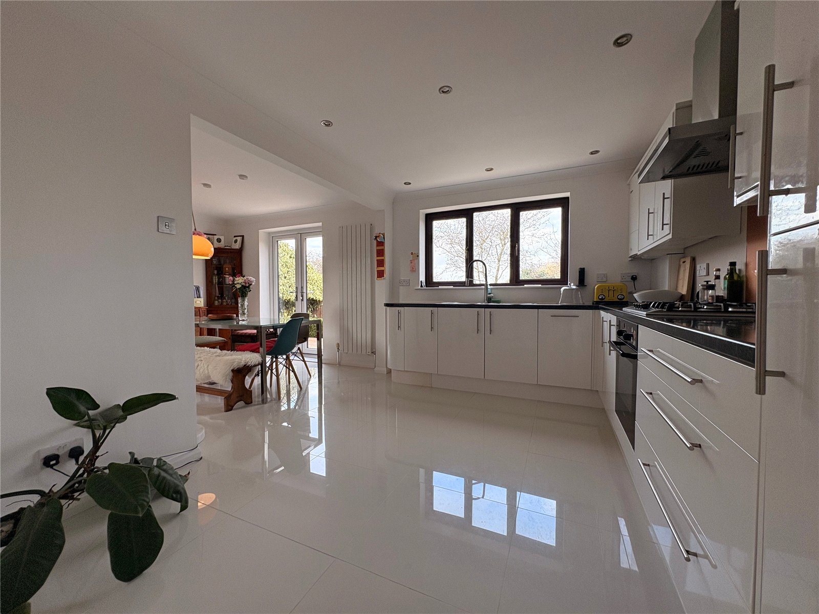 Kitchen Diner 20'5" (6.22m) x 12'6" (3.8m) Reducing to 9'5" (2.87m). An impressive open plan space with the kitchen area being fitted with a range of white high gloss fronted soft closing eye and base level units with granite effect rolled edge work surfaces over. The base units include a wide pan drawer stack and slimline dishwasher with further integrated appliances to include a fridge and freezer, Bosch electric oven and Bosch gas hob with feature glass splashback and stainless steel Fisher and Paykel chimney style extractor fan over. Inset stainless steel one and a half bowl single drainer sink unit with flexi hose mixer tap over. Wall mounted Worcester gas central heating boiler, inset spotlights, single panel radiator, Upvc double glazed window to rear aspect with views over open countryside, white panel door to utility room, porcelain tiled flooring continues to the dining area which has contemporary vertical radiator, coving to ceiling, Upvc double glazed French style double opening doors to the rear garden
