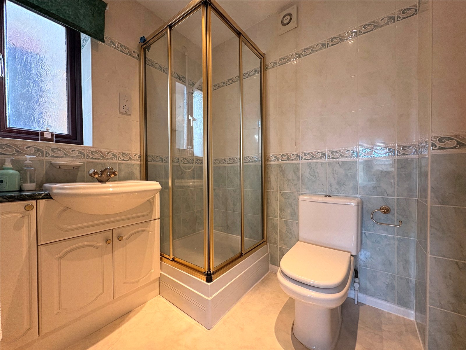 Ensuite Bathroom 6'7" x 5'7" (2m x 1.7m). Fitted with a three piece suite comprising of low level push flush WC, wash hand basin with central chrome mixer tap set onto a vanity unit with storage cupboard under and shelf to one side and shower cubicle with glass enclosure and door with Aqualisa shower. Full tiling to walls, heated towel rail, inset spotlights, extractor fan, shaver point, frosted Upvc double glazed window to side aspect with tiled sill