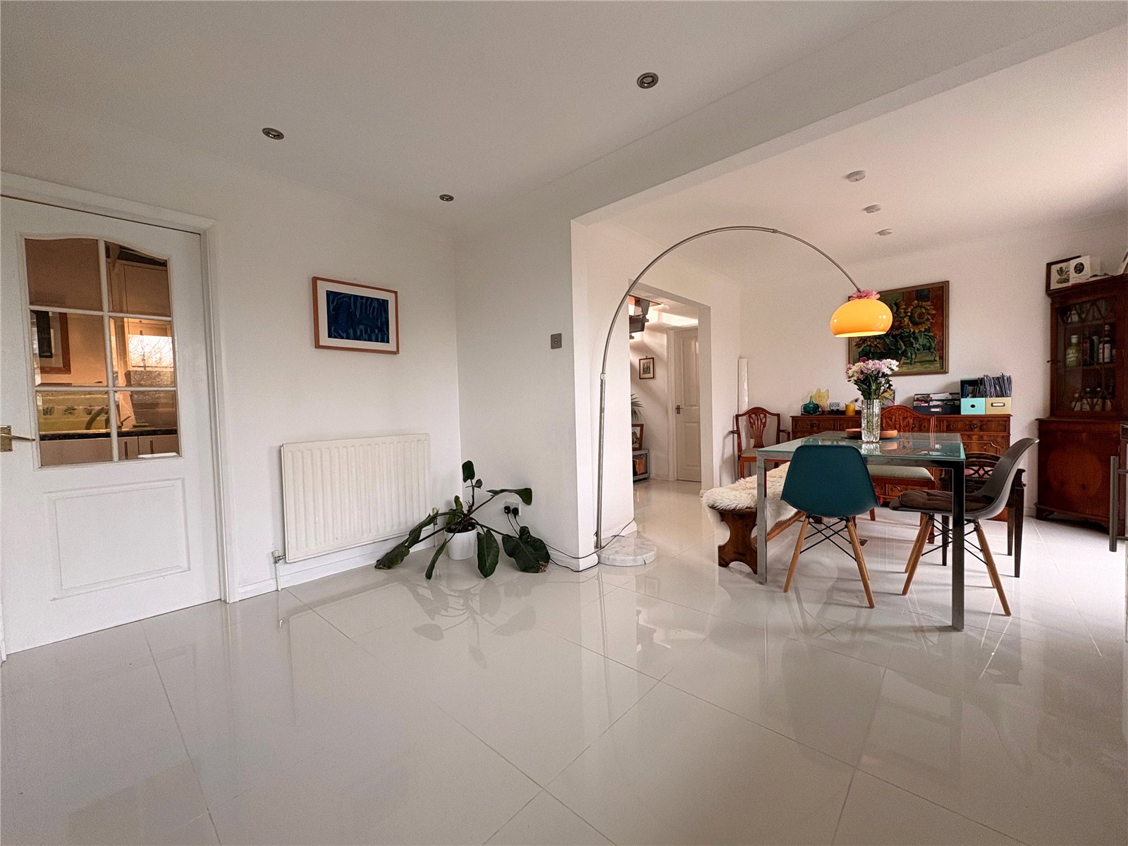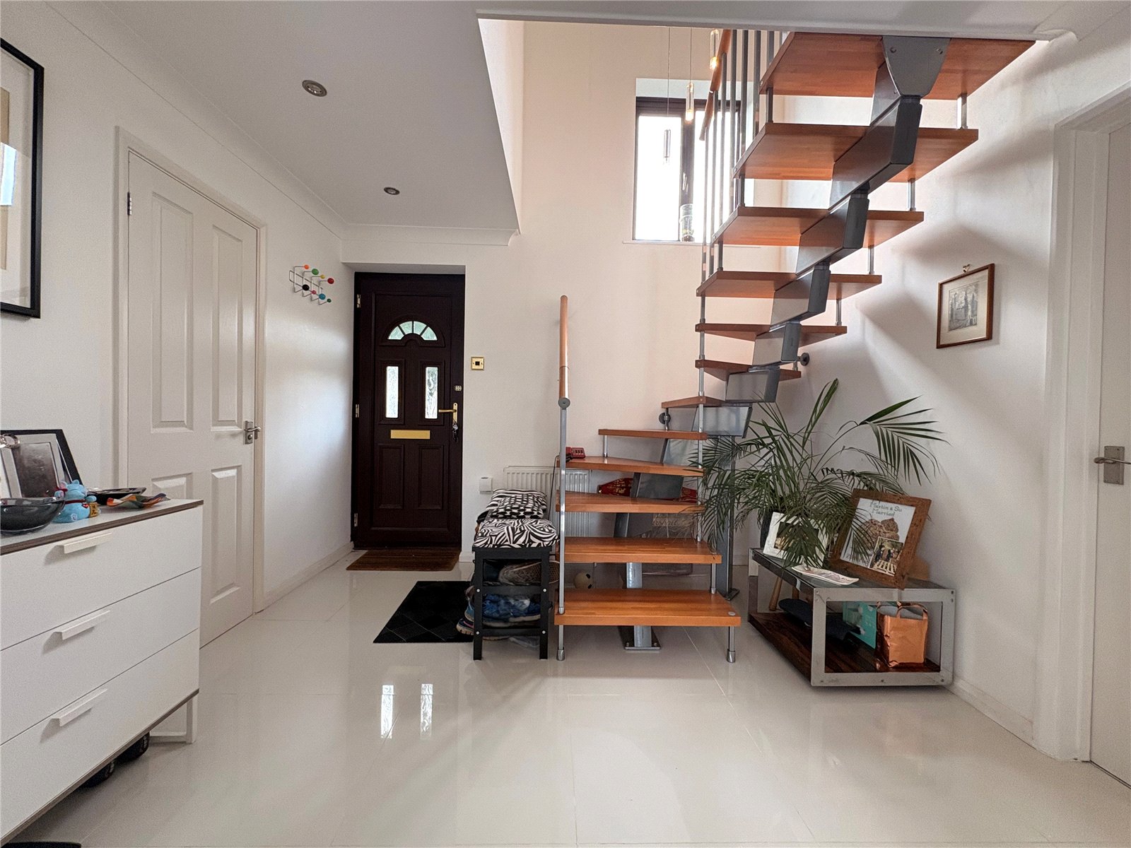 Reception Area 10'3" x 8'7" (3.12m x 2.62m). A beautiful open plan reception room which gives access to the ground floor with a wide opening to the dining area and with white panel doors to the lounge and cloakroom. The main focal point of the room is a bespoke staircase with beech tread and hand rail with chrome balustrades, inset spotlighting, coving to ceiling, double panel radiator, thermostat control panel, porcelain tiled flooring