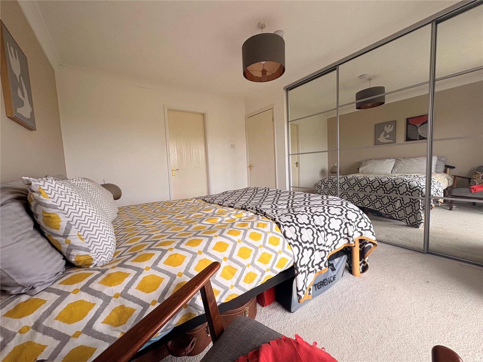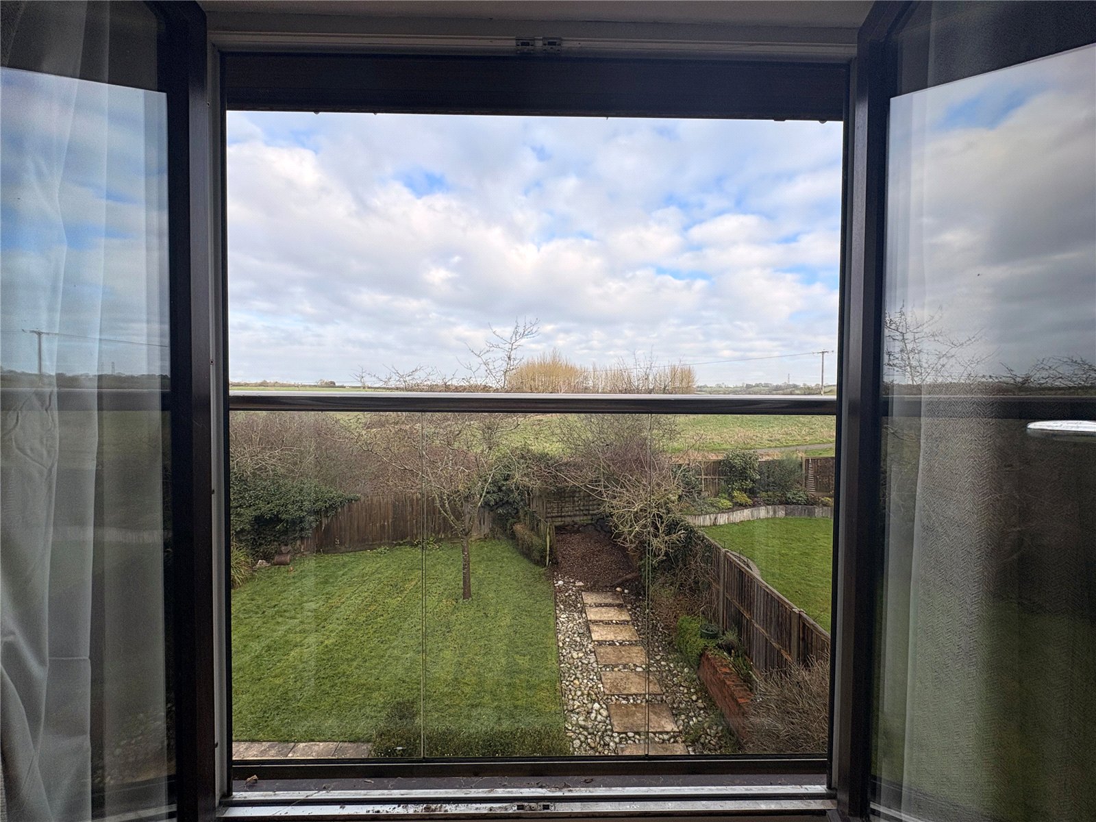 Bedroom One 12'7" x 9'9" (3.84m x 2.97m). A lovely main bedroom which has fitted wardrobes to one wall with sliding mirror fronted doors, coving to ceiling, vertical contemporary double panel radiator, Upvc double glazed inward opening French style doors retained by a glass Juliette balcony giving fantastic far reaching views over open countryside, white panel door to :-