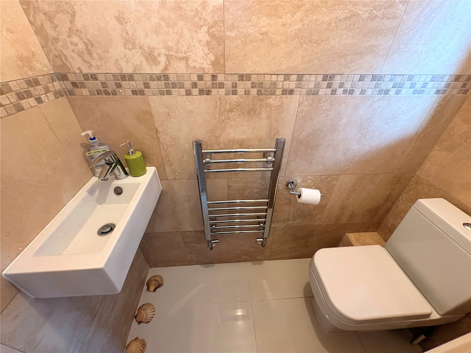 Cloakroom 5'5" x 2'5" (1.65m x 0.74m). Refitted with a white two piece suite comprising of low level push flush WC and rectangular wash hand basin with central chrome mixer tap, chrome heated towel rail, full tiling to all walls, continuation of porcelain tiled flooring from reception area, frosted Upvc double glazed window to front aspect with tiled sill