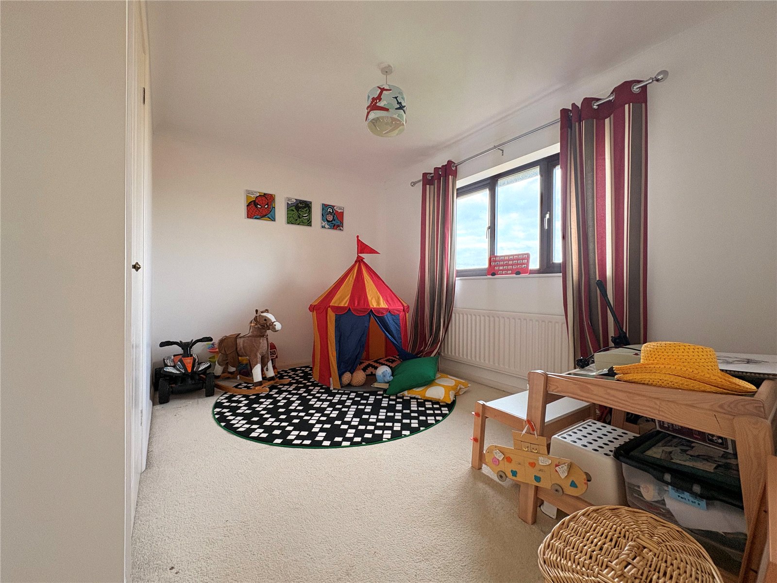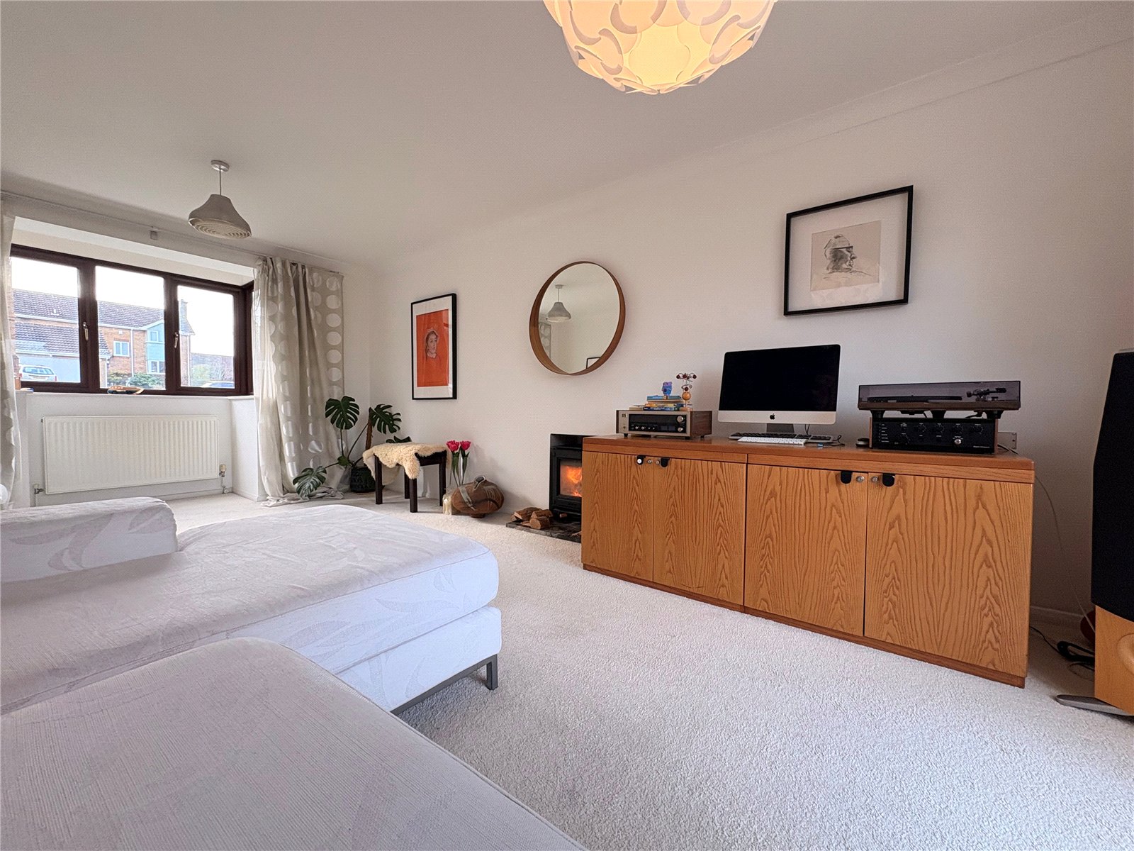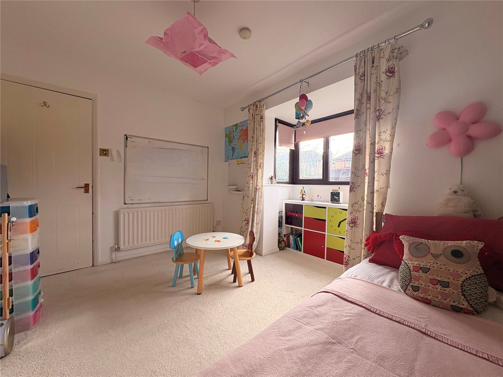 Bedroom Three 11'4" x 8'9" Max (3.45m x 2.67m Max). A further double bedroom with built in cupboard with slatted shelving and additional storage space, single panel radiator, open box bay to front aspect with Upvc double glazed window to three sides