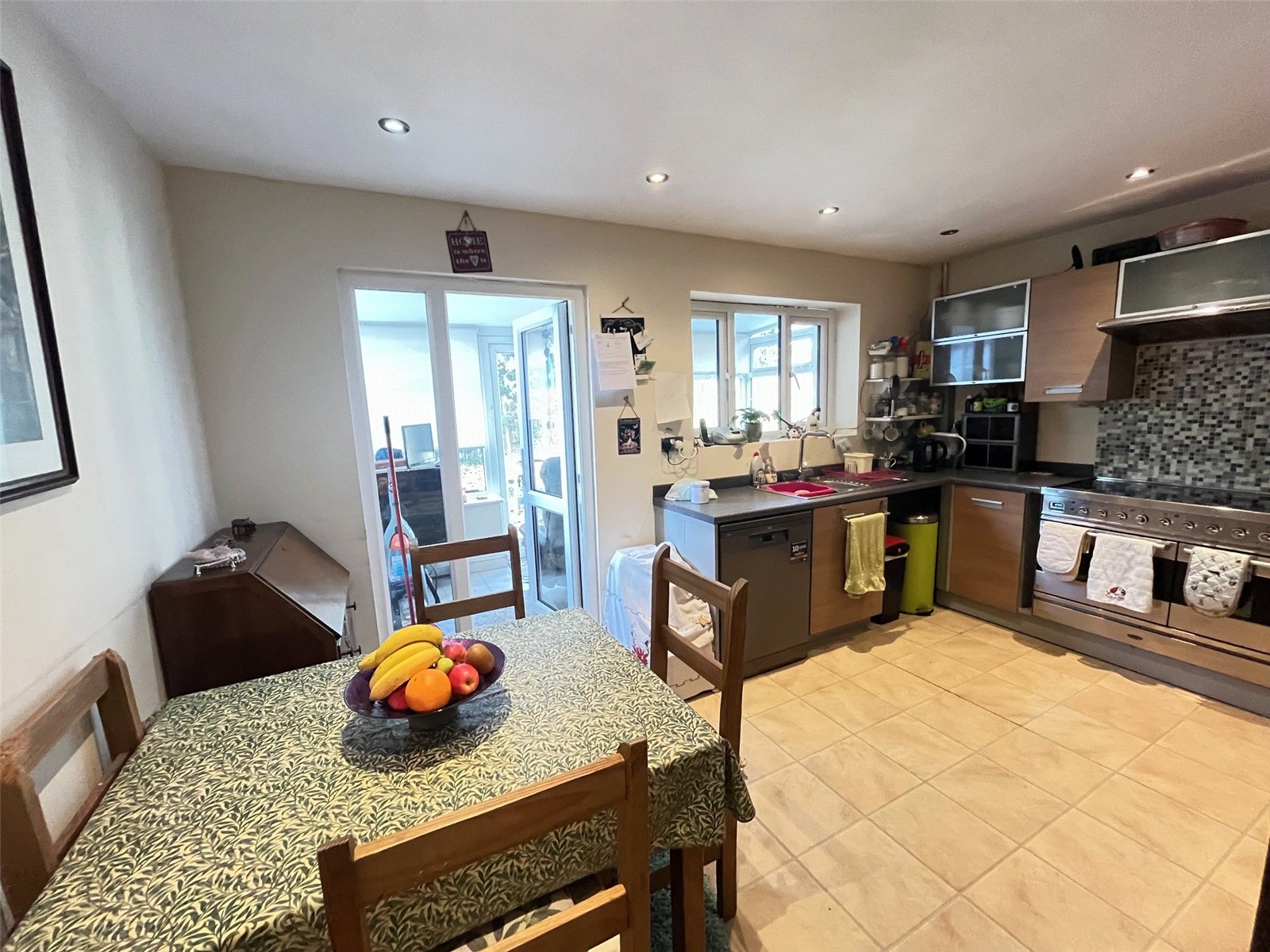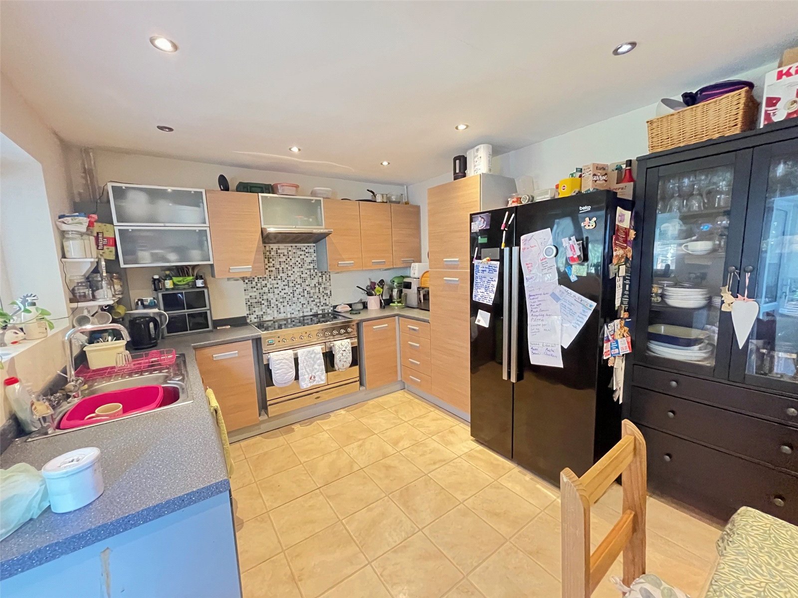 Kitchen/Diner 14'6" x 10'2" (4.42m x 3.1m). Fitted with a range of eye and base level units with rolled edge worksurfaces over with matching upstands and under unit lighting. Space for Range style cooker (Available for separate negotiation) Inset one and a half bowl stainless steel sink and drainer unit with swan neck mixer tap over, space and plumbing for dishwasher, space for upright American style fridge/freezer, full height storage cupboard, drawer stack, recessed spotlights, ceramic tiled floor, Upvc double glazed window to conservatory, part opaque Upvc double glazed door to :-
