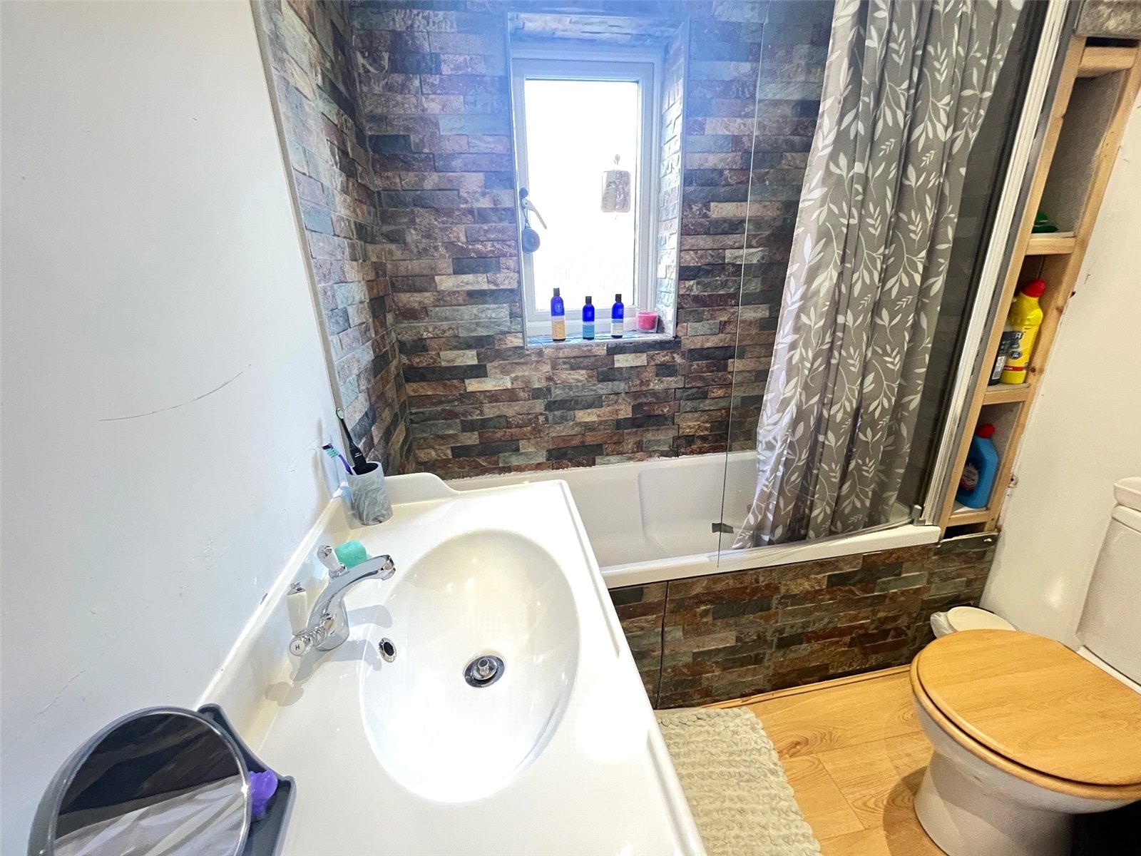 Bathroom 7'2" x 6'2" Max (2.18m x 1.88m Max). Fitted with a white three piece suite comprising of low level WC, oversized wash hand basin with mixer tap set into a vanity unit, panel bath with mixer tap and electric shower over and shower screen, tiling to water sensitive areas, opaque Upvc double glazed window to rear aspect, recessed spotlights, shelving unit, chrome heated towel rail