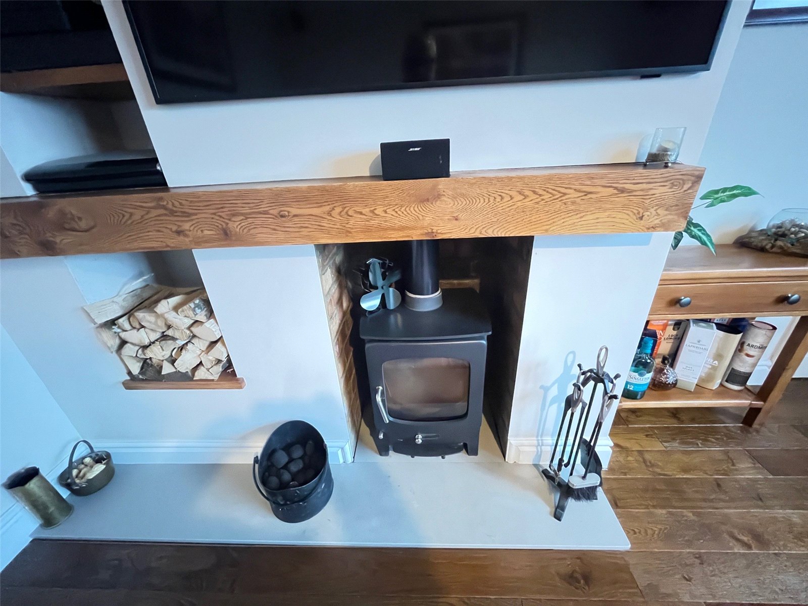 Lounge 14' x13'4" (4.27m x4.06m). A delightful room with the focal point being a inset multi fuel burner set into a fireplace with wooden mantle over, with inset recessed shelving, wood flooring, coving to ceiling, radiator, BT point, Upvc double glazed window to front aspect