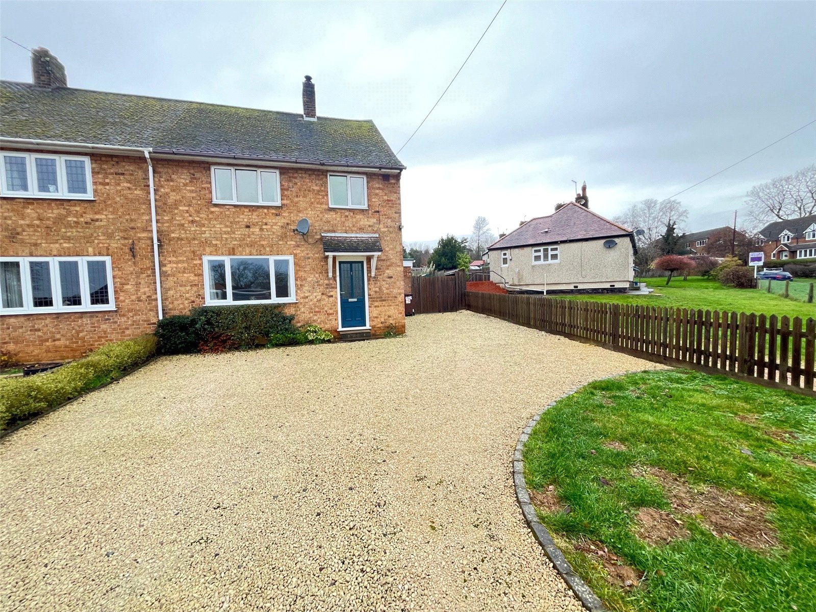 Front Low maintenance frontage with gravel driveway for several cars, lawn borders, enclosed by wood picket fence and low level hedges/shrubs