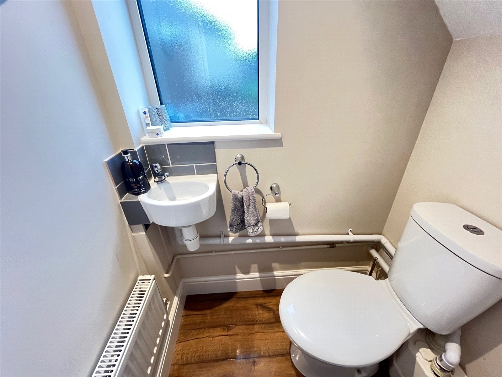 WC 4'2" x 2'8" (1.27m x 0.81m). Fitted with a white two piece suite comprising of low level WC, contemporary corner wash hand basin and tiled splashback, radiator, wood laminate floor, extractor, recessed lighting, opaque Upvc double glazed window to side aspect