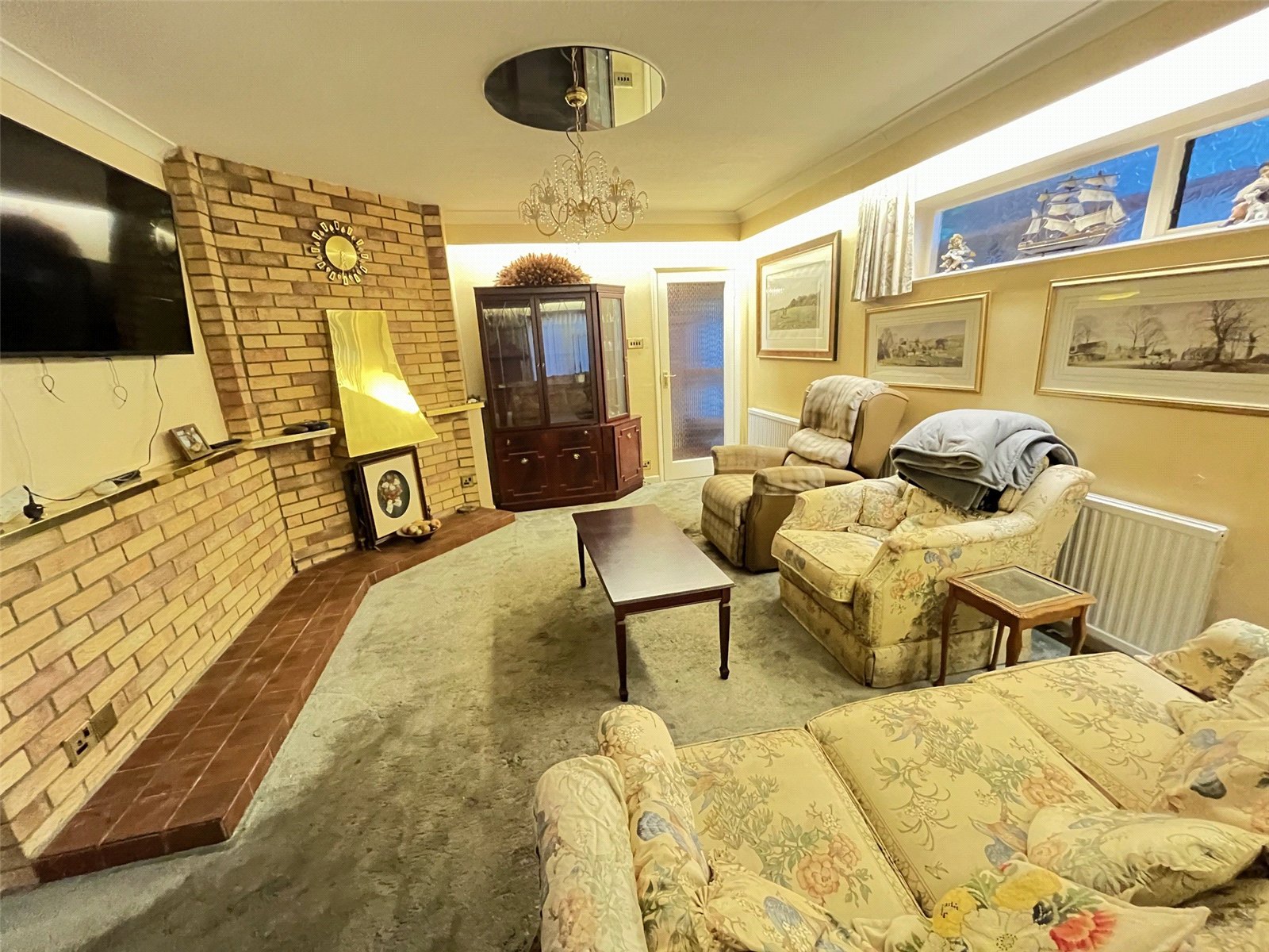 Lounge 26' x 12'6" (7.92m x 3.8m). An extended room with feature fireplace with brick surround, tiled base and inset gas fire, three radiators, coving to ceiling, Upvc double glazed French doors opening onto rear garden, opaque window to side covered walkway, door to :-