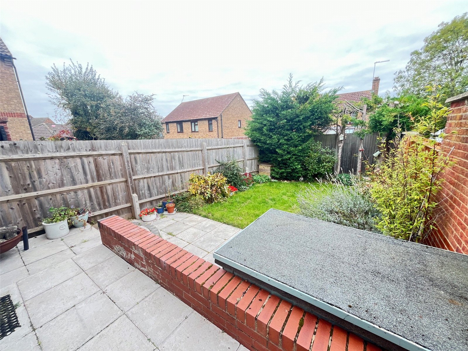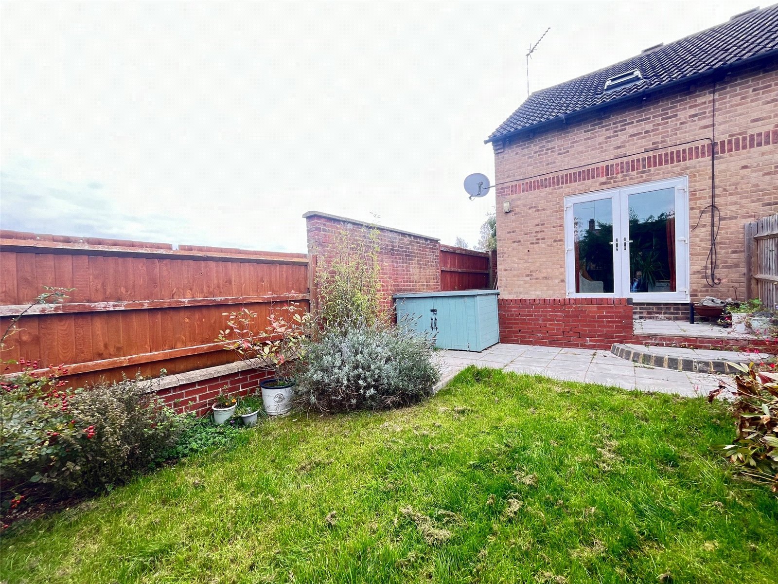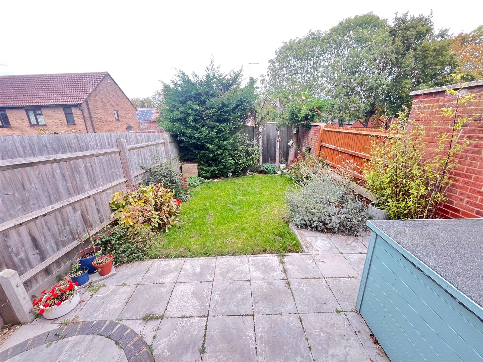 Rear    A private and enclosed garden with a paved patio area, steps down to a further paved patio area, lawn area with shrub and flower borders, side storage area with gated access to front, outside light, enclosed by brick wall and timber fencing.