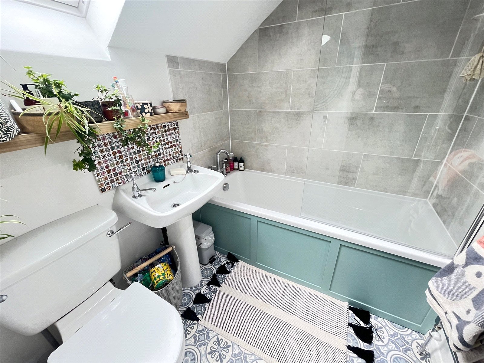 Bathroom 6'2" x 5'6" (1.88m x 1.68m). Fitted with a white three piece suite comprising of a low level WC, pedestal wash hand basin, panel bath with mixer tap with electric shower over, tiling to water sensitive areas, chrome heated towel, extractor, double glazed Velux window to front aspect.