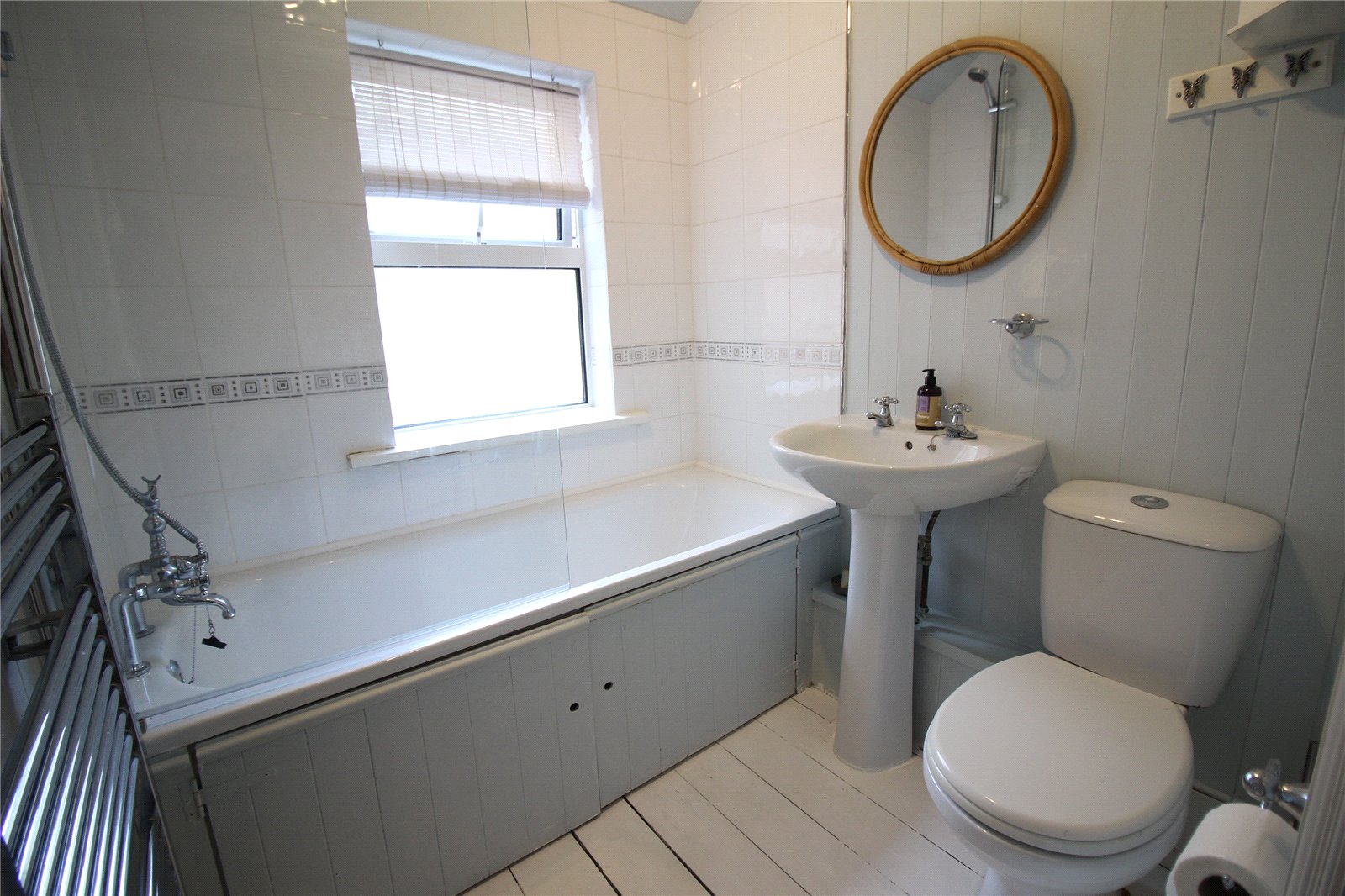 Bathroom 6' x 5'8" (1.83m x 1.73m). The bathroom is fitted with a white three piece suite comprising bath with shower over and full height tiling around, pedestal wash hand basin and low level wc, chrome heated towel rail, painted wood panelling to remaining walls, painted floorboards, frosted upvc double glazed window to side aspect.