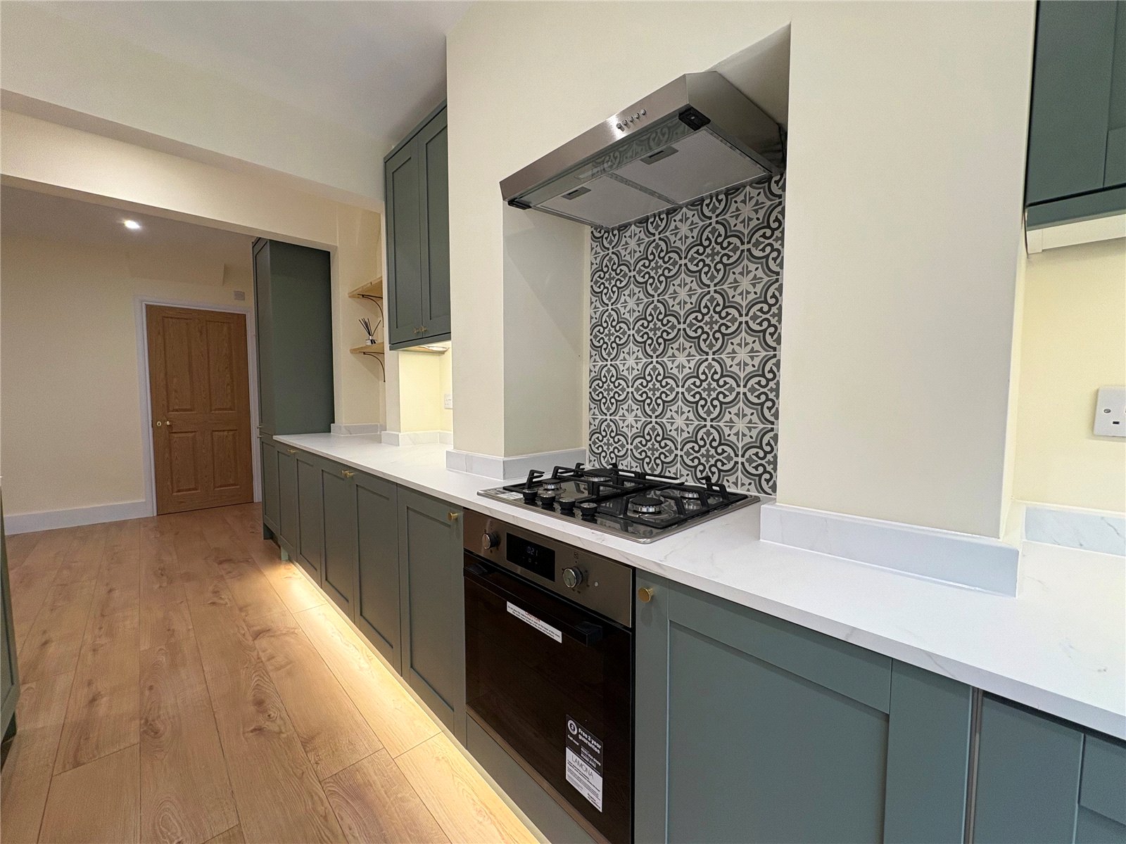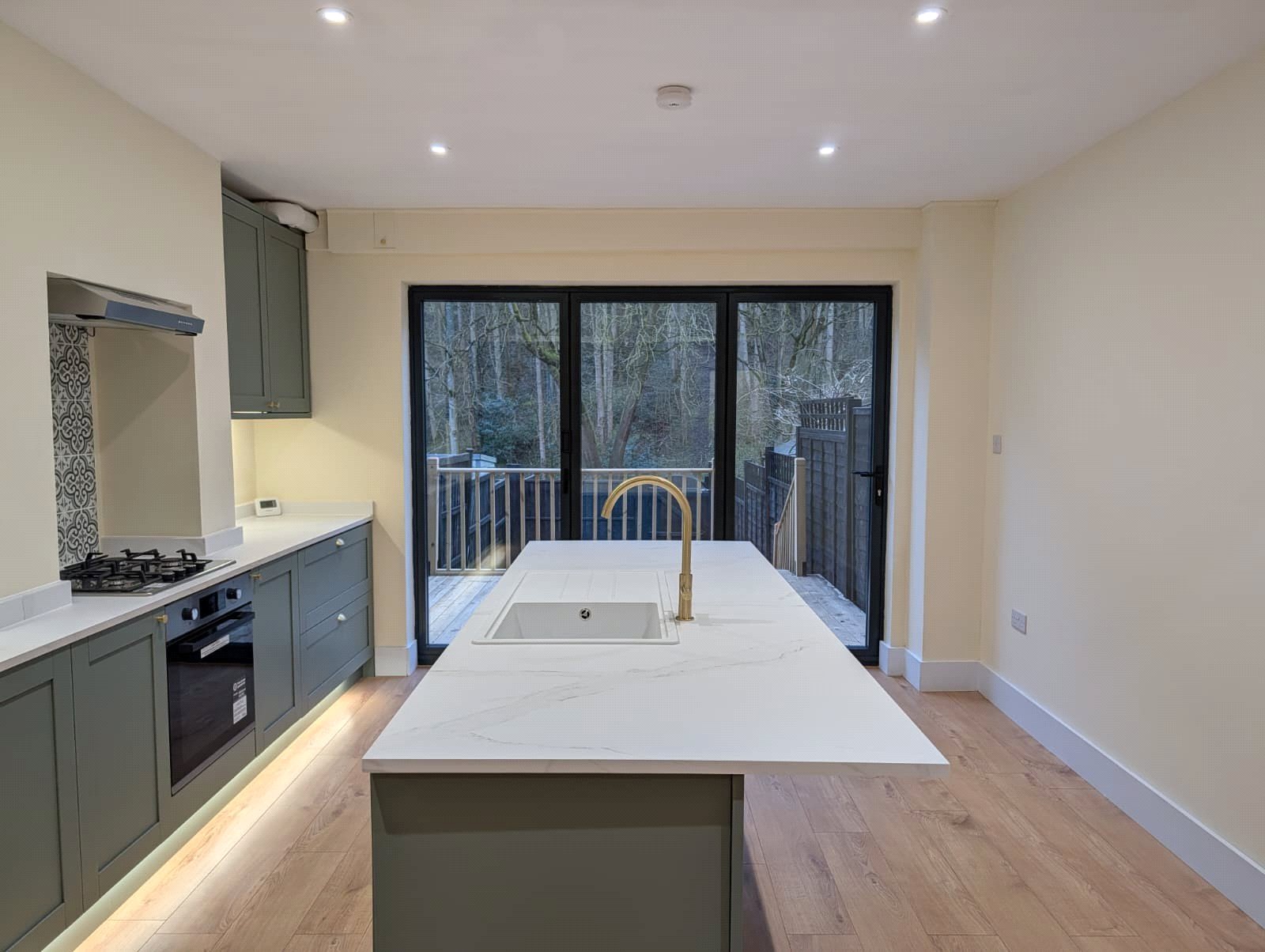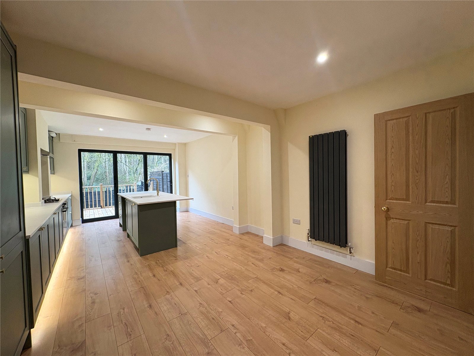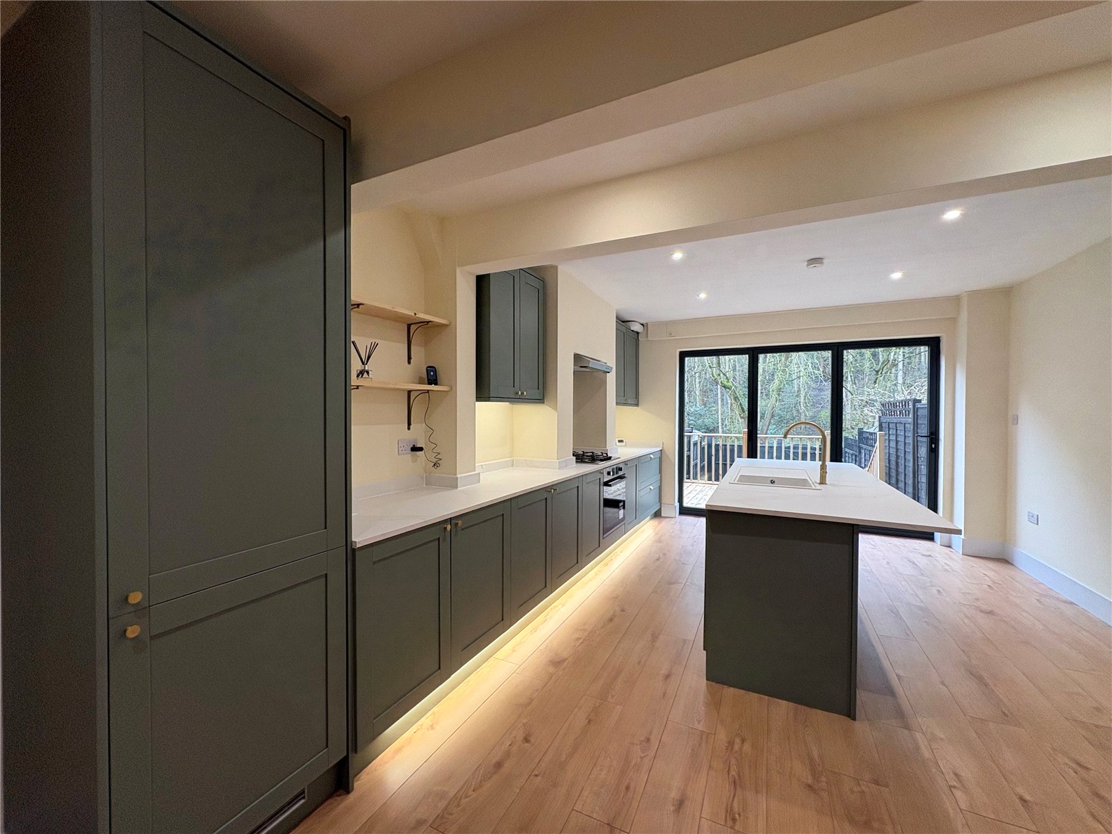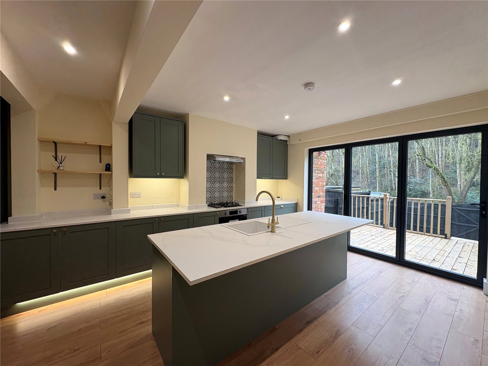 Kitchen/Family Breakfast Room 22'1" x 12'5" (6.73m x 3.78m). The jewel of this property is this superb kitchen family breakfast room with large central island unit and bi-fold doors opening out onto a decked seating area and overlooking open woodland to the rear of the house. The kitchen has been comprehensively refitted and now boasts an ample range of both base and eye level units running along one wall plus the addition of a 7'5" central island unit which provides additional bar seating and also houses the inset single drainer sink unit with swan neck mixer tap over, inset stainless steel gas hob with decorative feature tiled splash back and canopy extractor fan over, built in stainless steel electric oven, built in dishwasher, built in fridge and freezer, wide pan drawers, display shelving, space and plumbing for washing machine, under unit and plinth lighting, square edge marble effect work surfaces and matching upstands, wall mounted and newly installed gas combination boiler concealed behind the wall units, wood effect flooring and deep skirting, inset downlighters, feature vertical radiator, pine door to :-