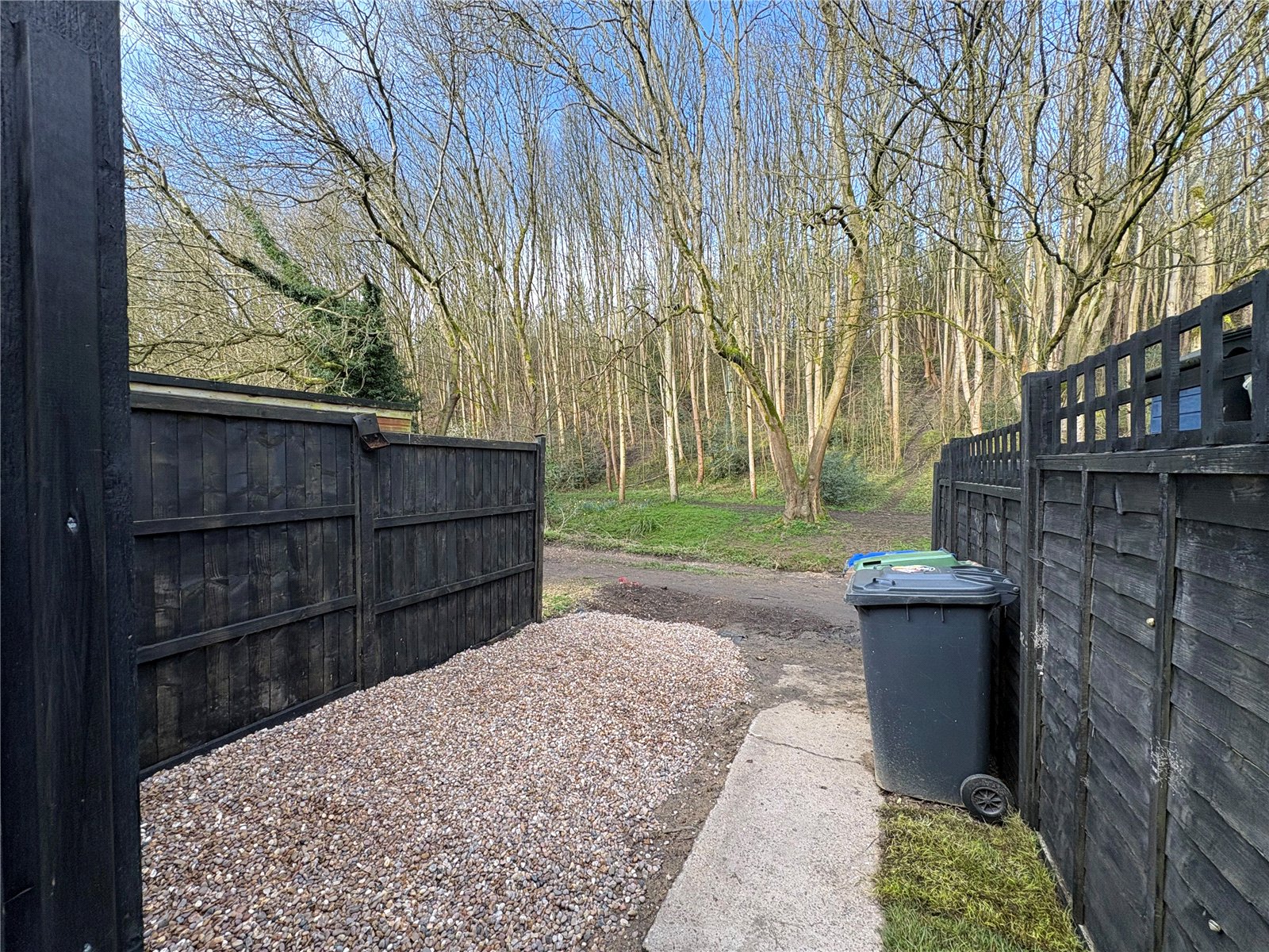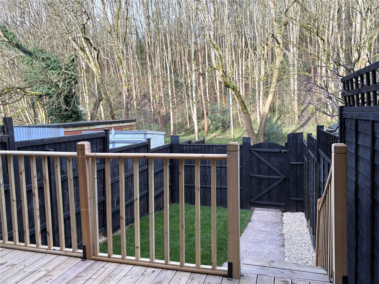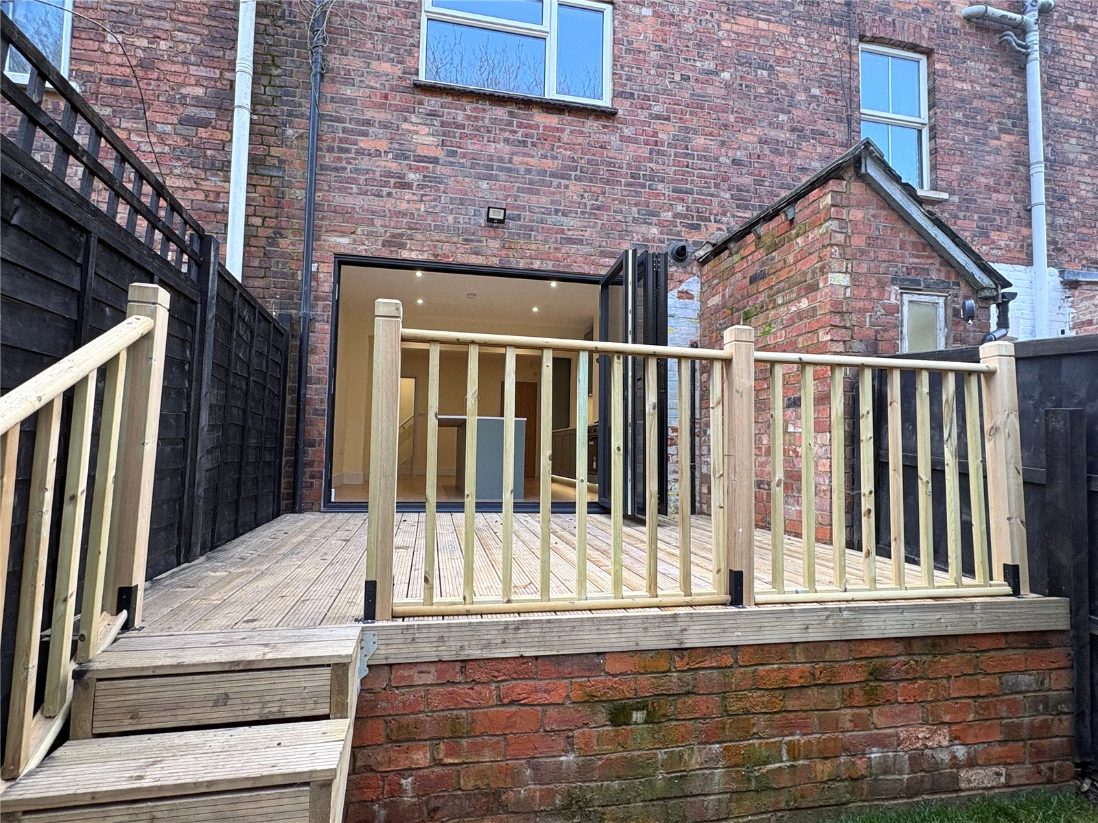 Rear A lovely rear garden with decked seating area directly behind the bi-fold doors with spindled balustrading, steps lead down to a lawned area with pathway to gated access which opens onto the parking area which is enclosed either side by timber fencing, the garden is fully enclosed by 6ft timber fencing