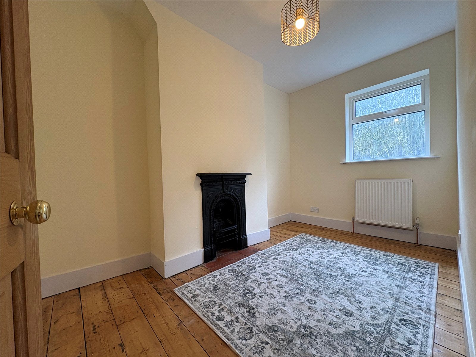 Lounge 12'5" x 11'2" (3.78m x 3.4m). A good size room with stripped pine floor and deep skirting, feature open fire place with tiled hearth and timber mantle, vertical feature radiator, Upvc double glazed window to rear aspect overlooking woodland