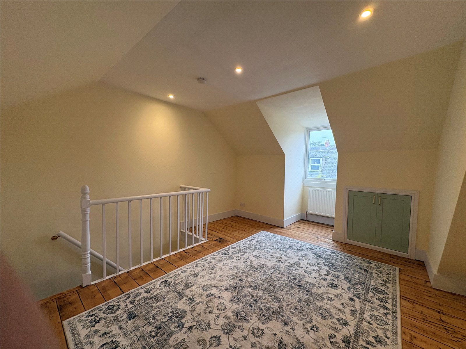 Principal Bedroom 13.3 x 41'8" (12.7m)ax reducing to 11.3 plus window recess. Upvc double glazed window to front aspect. stripped pine flooring with deep skirting, white spindled gallery, built in cupboard into eaves, inset downlighters
