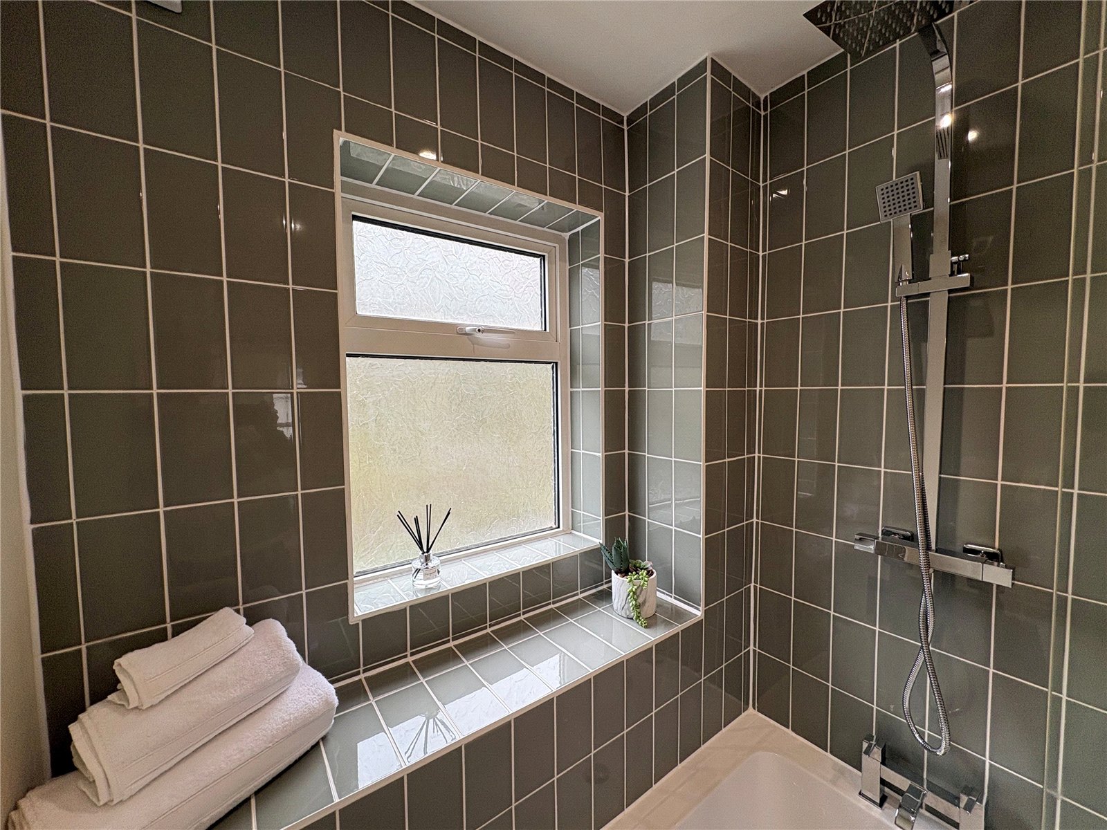 Bathroom 8'3" (2.51m) x 5'1" (1.55m) Plus Recess. A lovely refitted bathroom comprising of shower bath with both fixed head and flexi head shower and glass shower screen, pedestal wash hand basin with tiled splashback, close couple WC, tiling to bath area, stripped pine floor and deep skirting, heated towel rail, extractor fan, inset downlighters, Upvc double glazed window to rear aspect