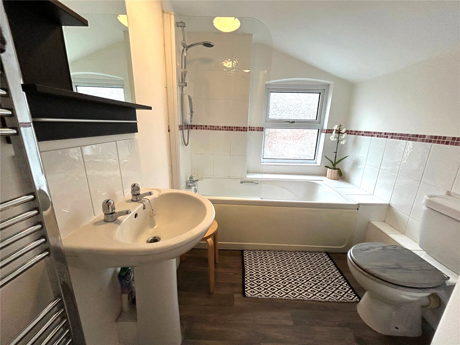 Bathroom 8'9" x 6'4" (2.67m x 1.93m). Fitted with a white three piece suite comprising panel bath with Triton electric shower over and glass shower screen, pedestal wash hand basin and close coupled WC, partial tiling, built in cupboard to one corner, heated chrome towel rail, frosted Upvc double glazed window to rear aspect.