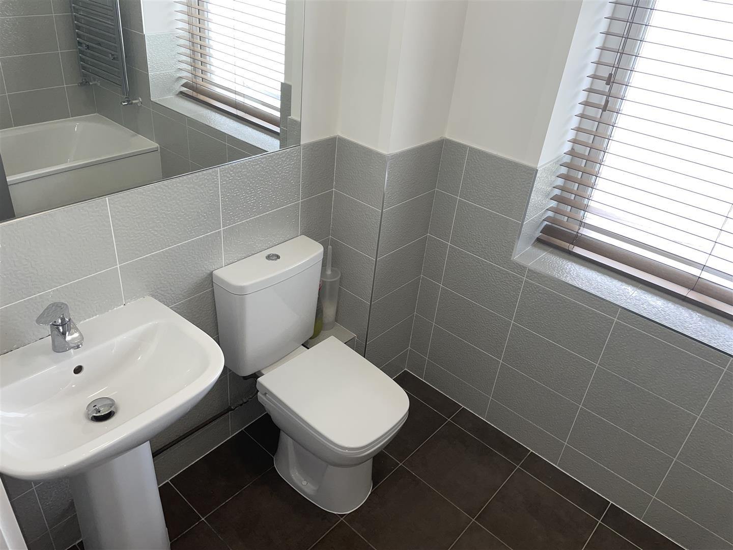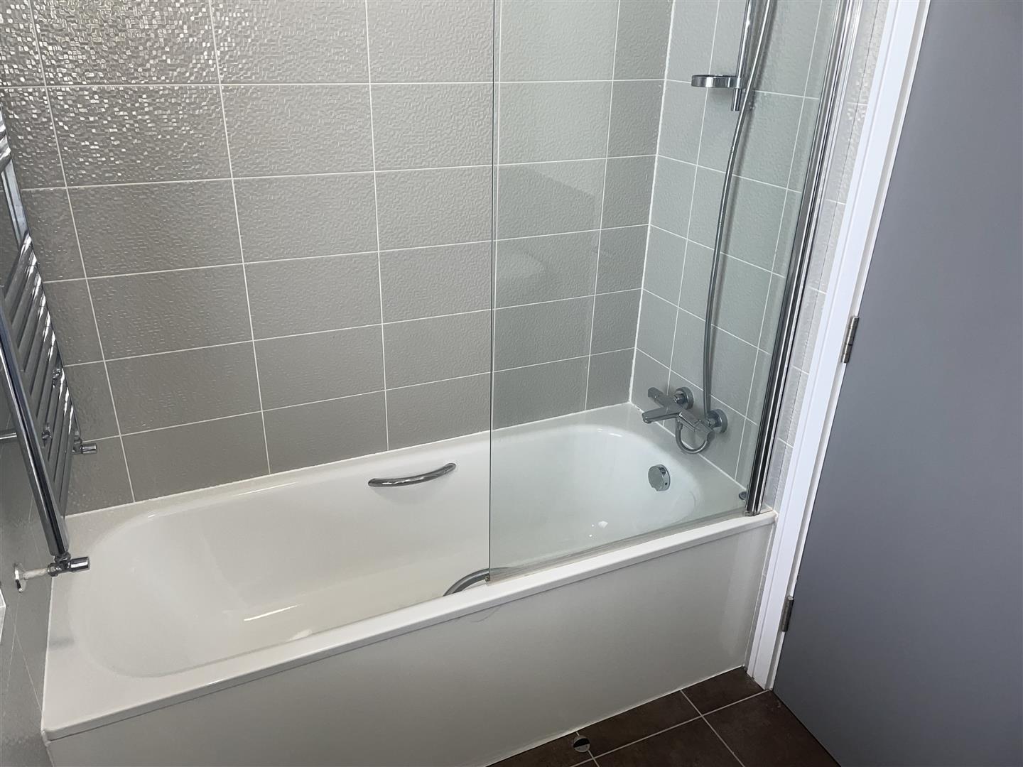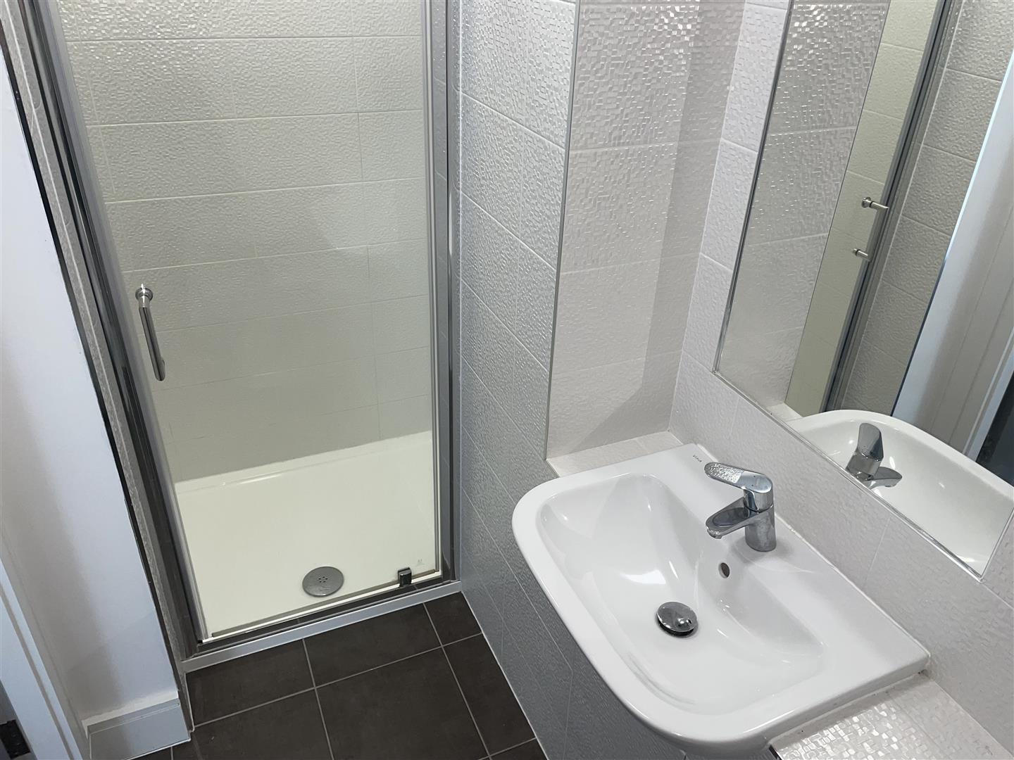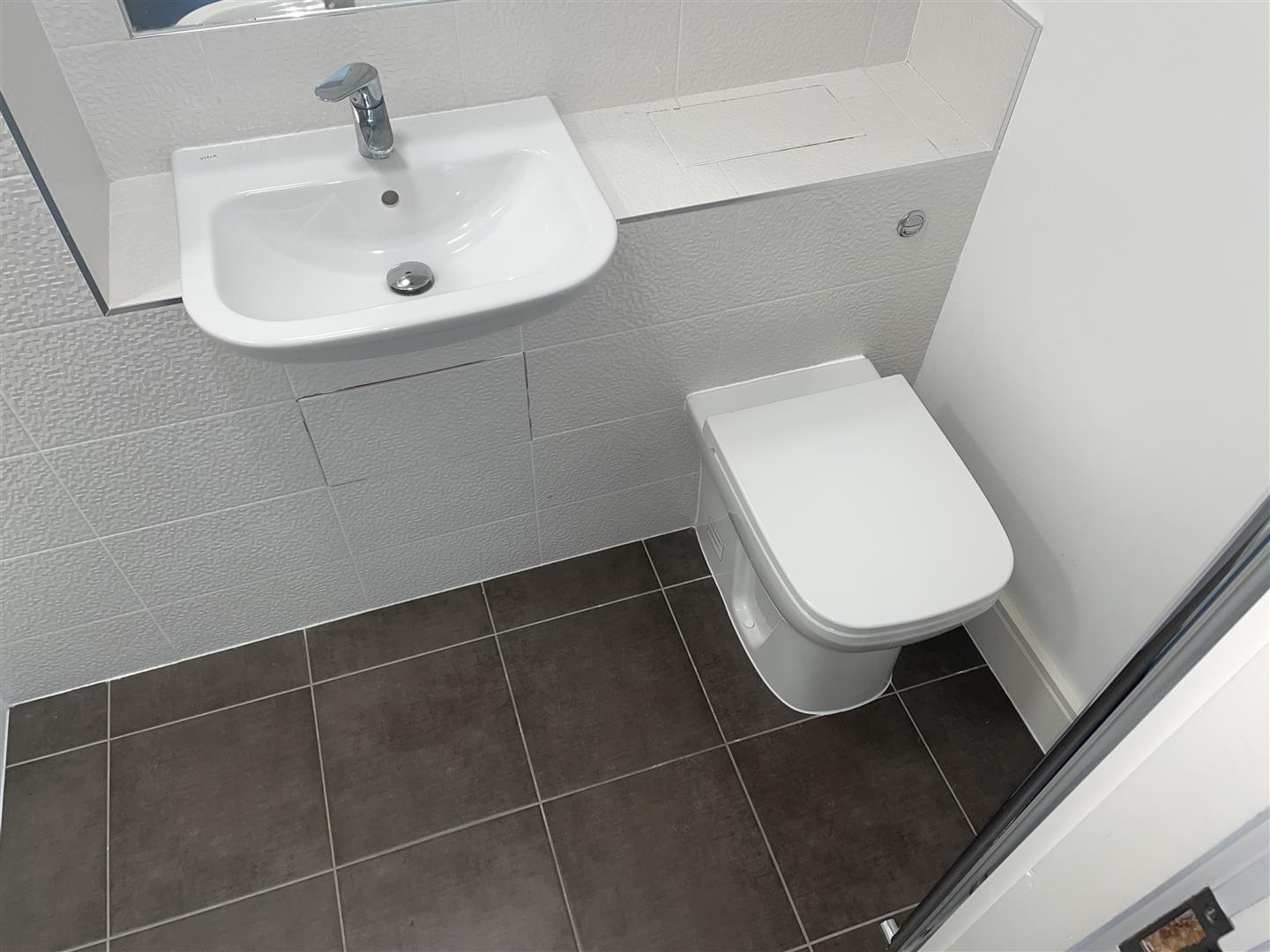 Ensuite Bathroom - Part tiled walls and flooring, walk in shower cubical with electric shower, low level w.c. and sink unit, ladder towel rail
