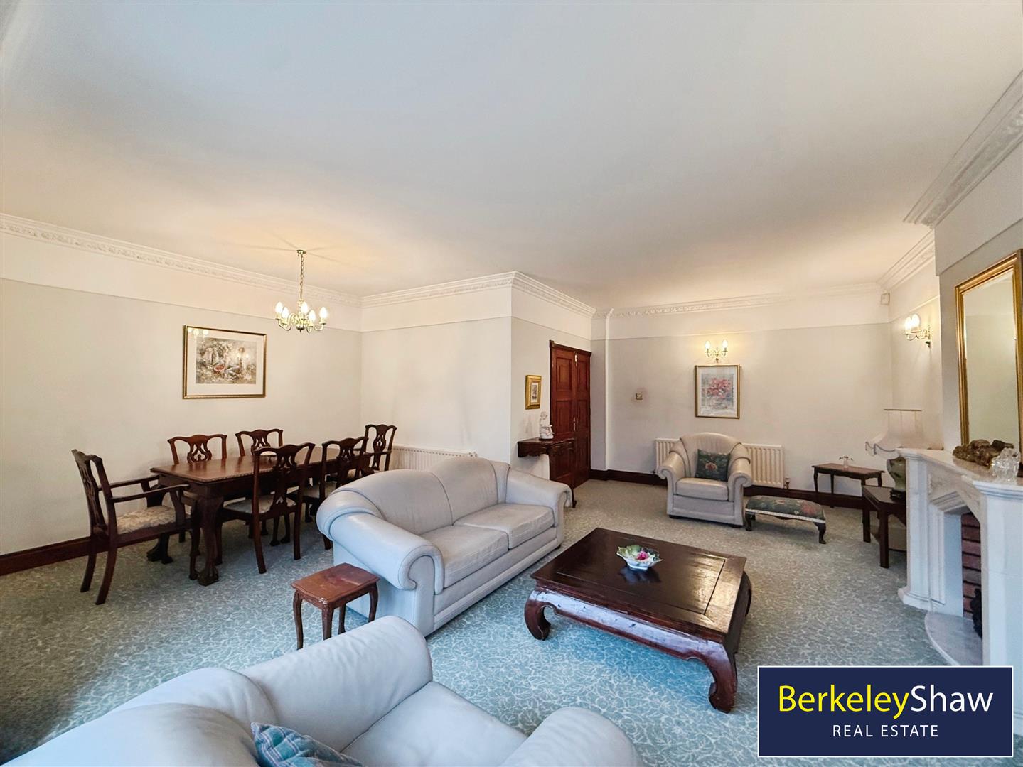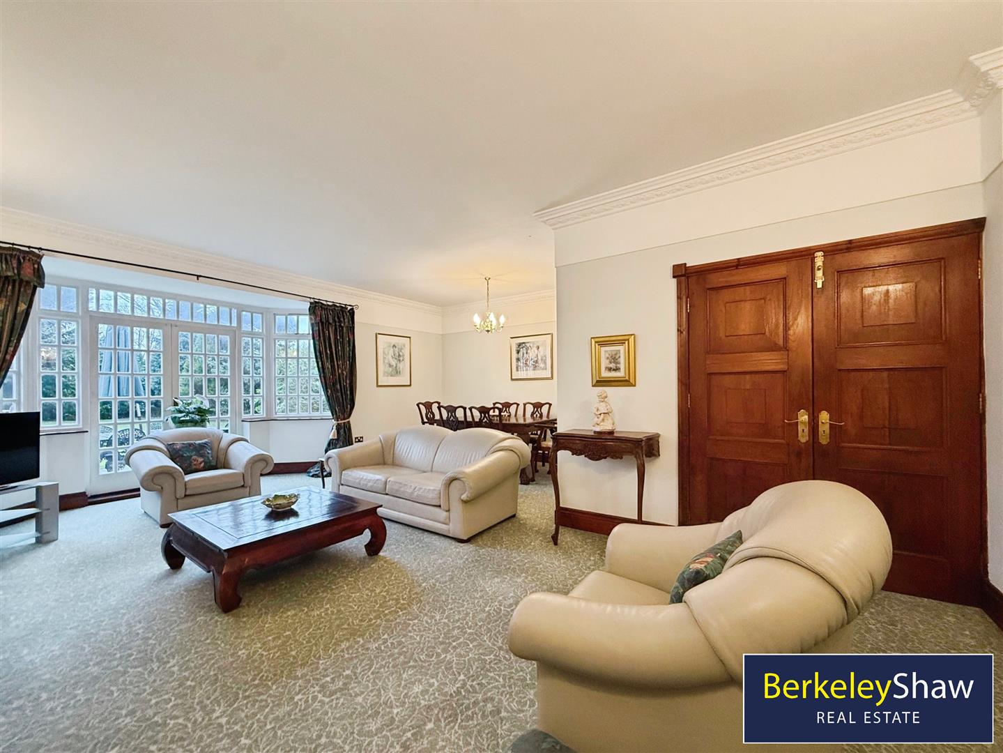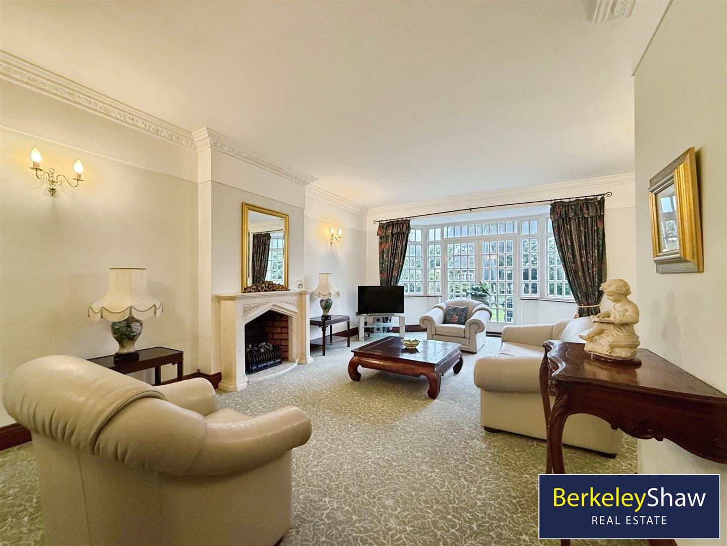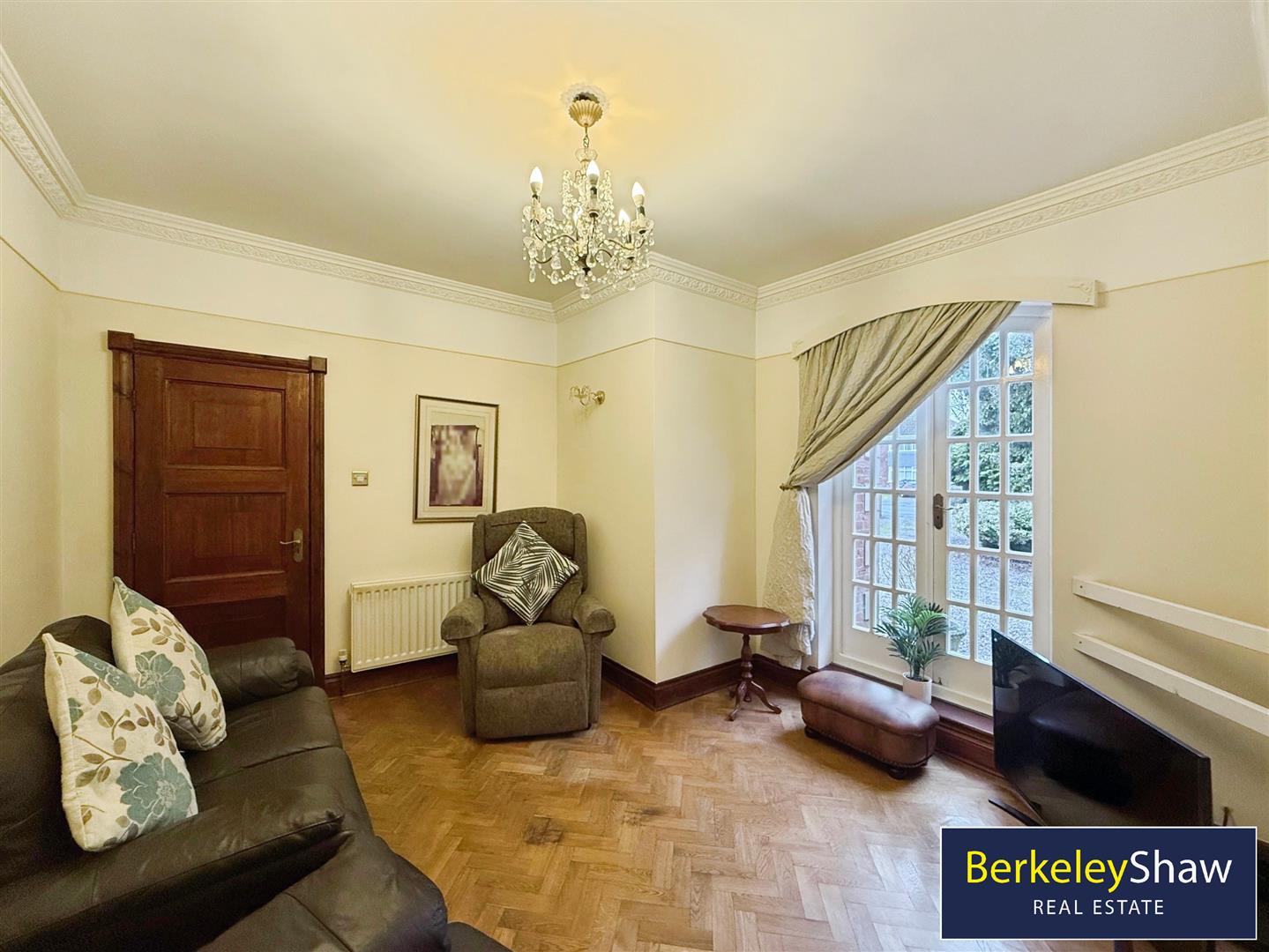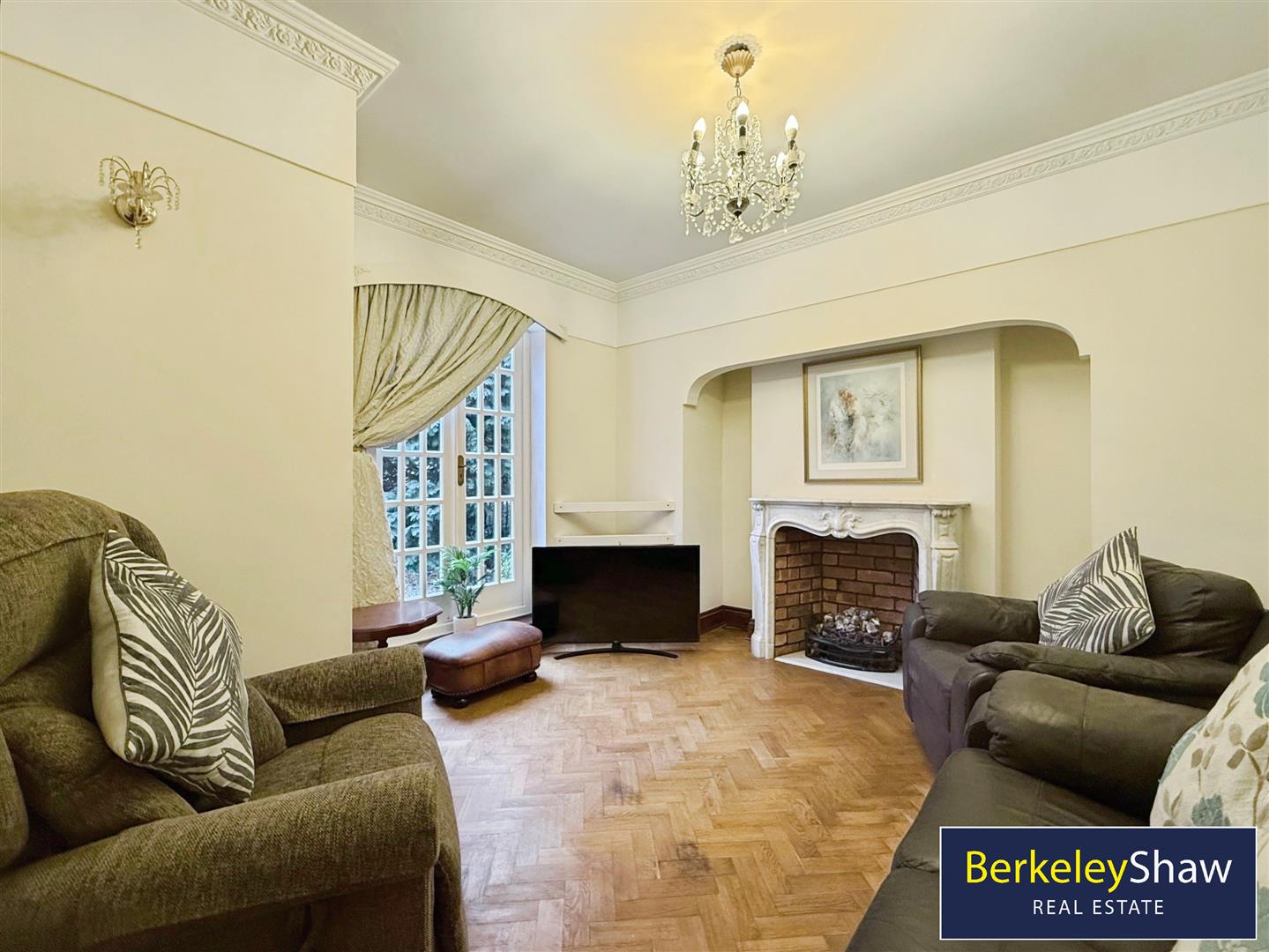 The property features two reception rooms, both with fireplaces and large windows. The main reception is open-plan with garden views and direct access to the south-facing garden, creating a well-connected living and entertaining area. The second reception room provides an additional flexible living space.