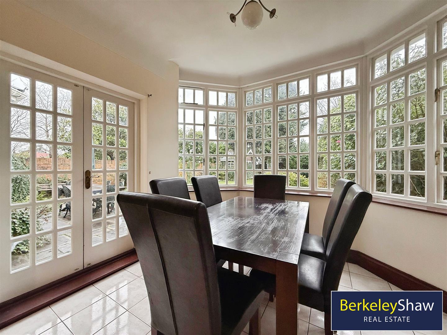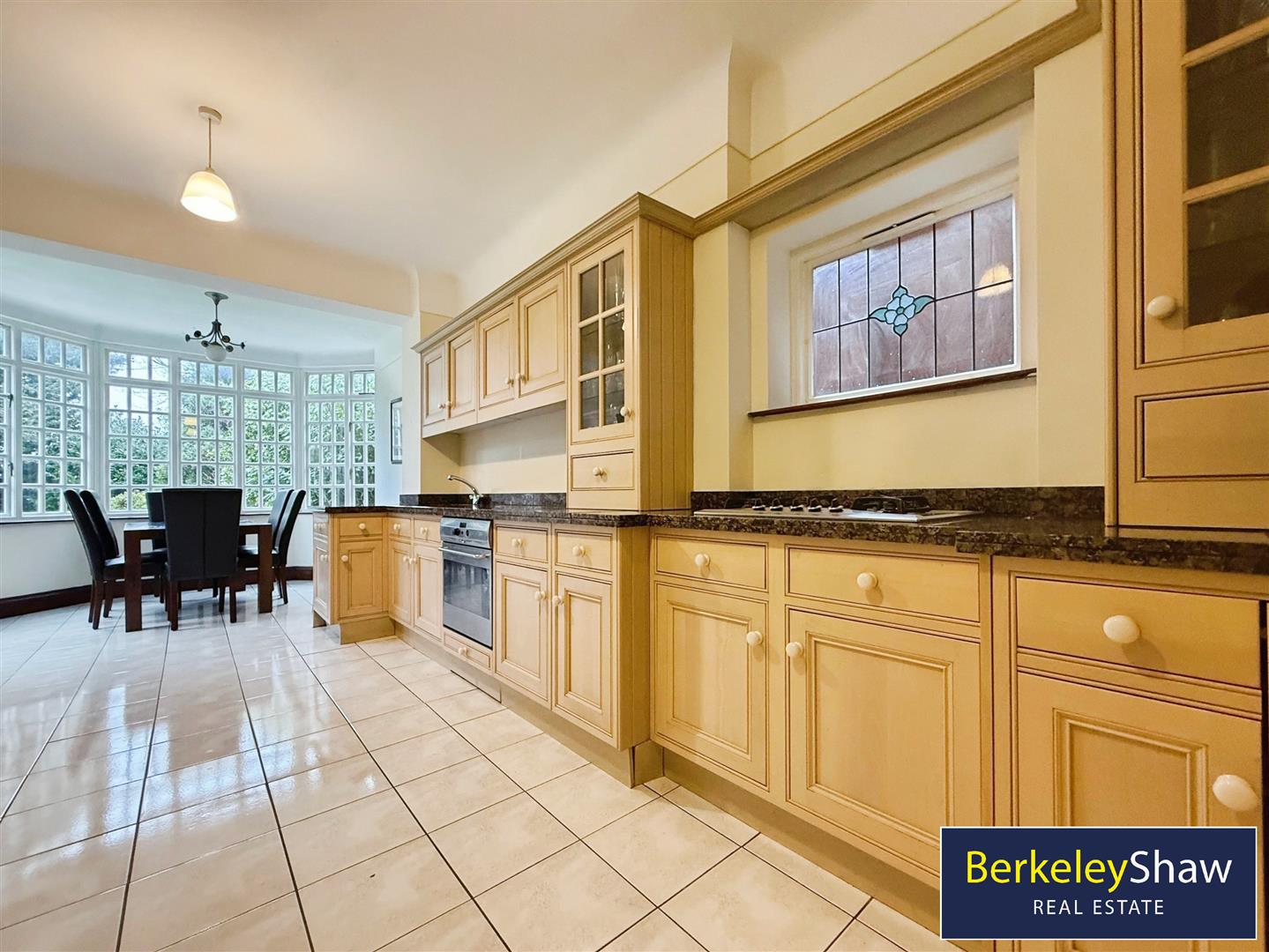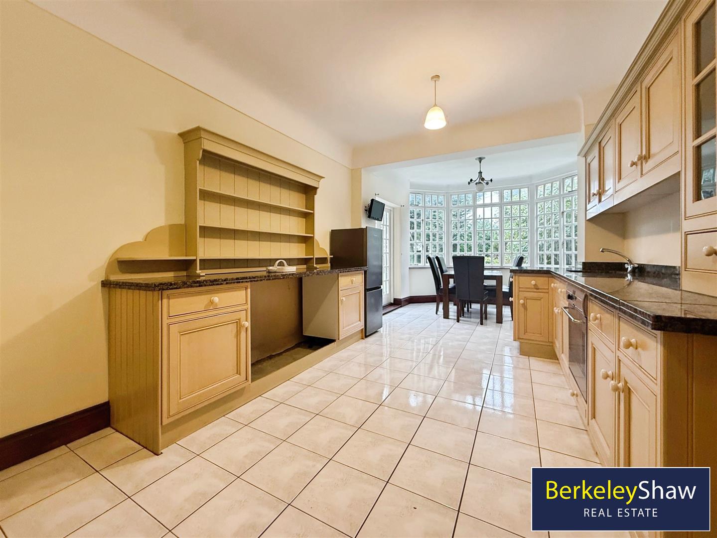 The open-plan kitchen includes marble countertops, built-in pantries, a breakfast area and dining space. Large windows and garden patio doors provide good natural light and direct access to the garden and BBQ area. A mezzanine level offers additional versatile space.