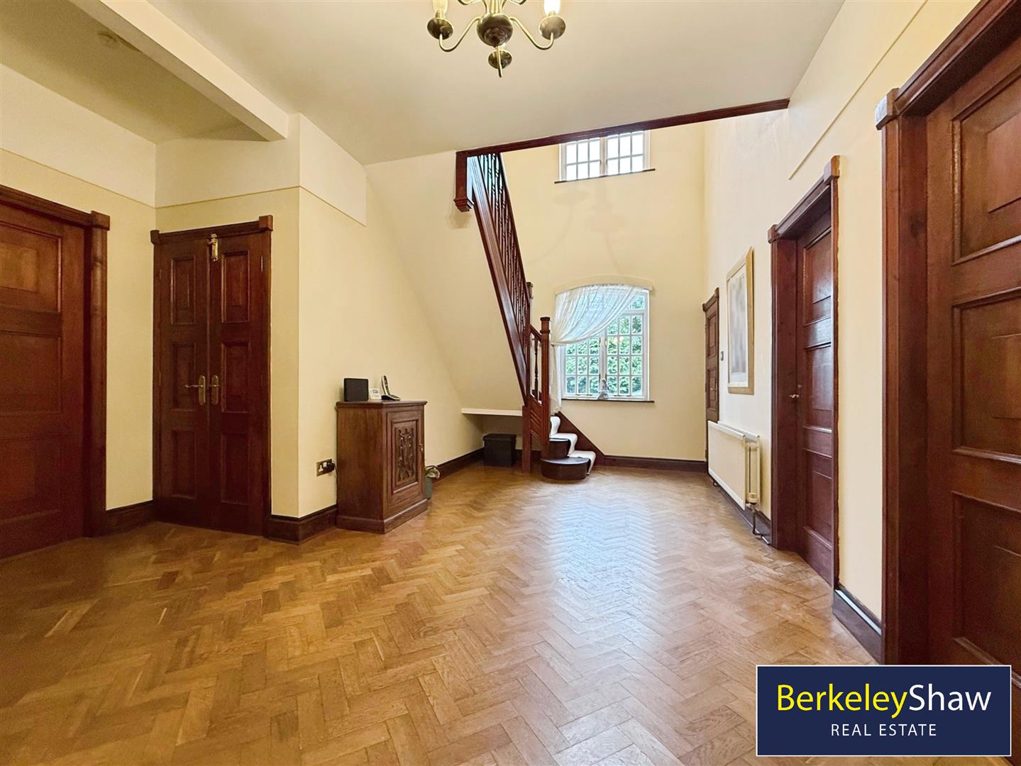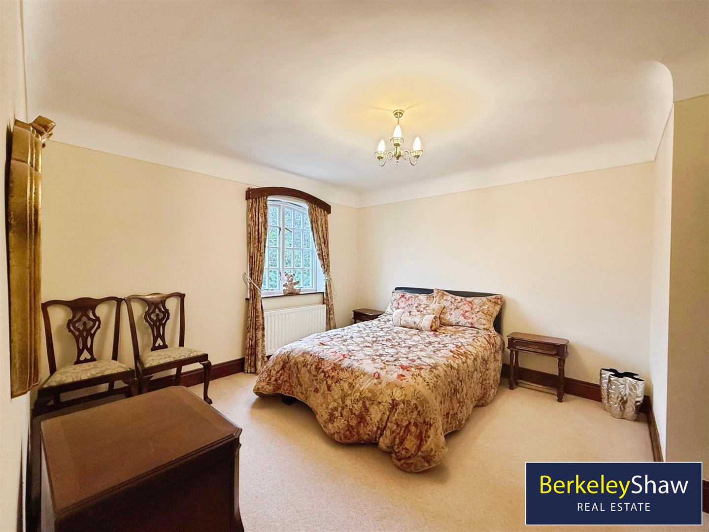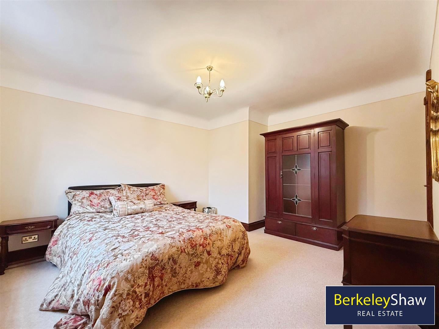 There are four double bedrooms. One master bedroom benefits from an en-suite, while a second master bedroom includes a walk-in closet and dressing room. A further two double bedrooms complete the sleeping accommodation. The main bathroom includes a free-standing bath and built-in storage, with a second bathroom featuring a rain shower and built-in storage. The property falls within Council Tax Band F.