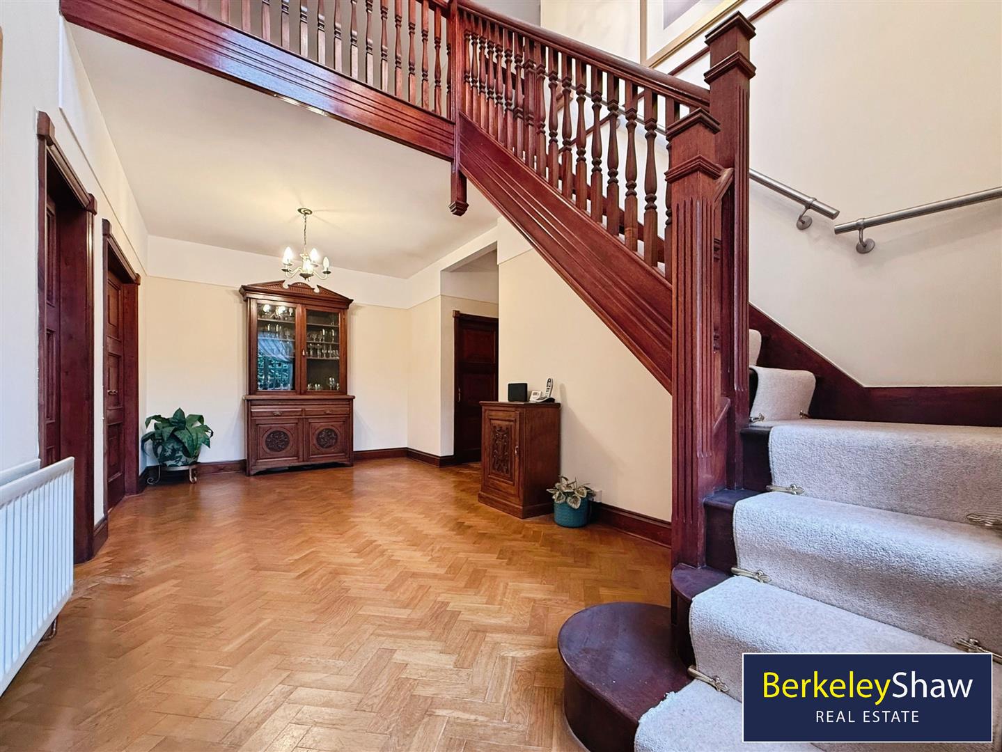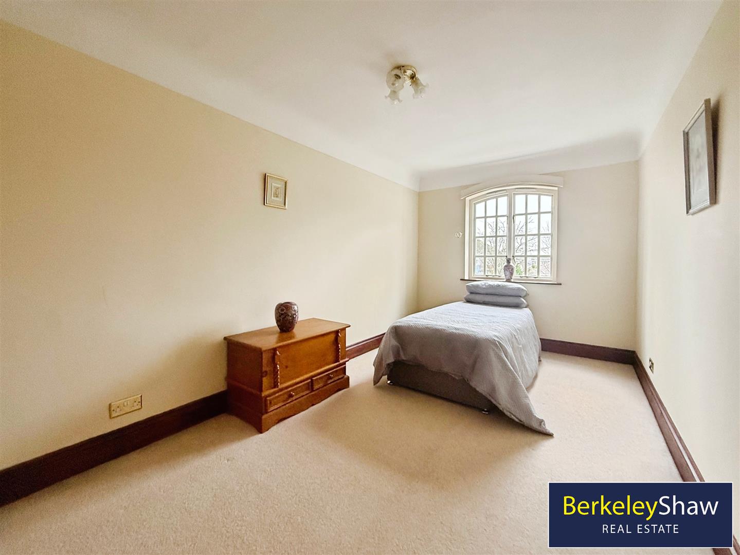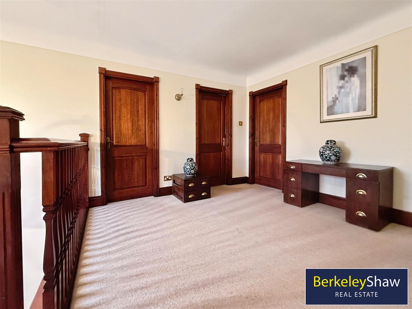 There are four double bedrooms. One master bedroom benefits from an en-suite, while a second master bedroom includes a walk-in closet and dressing room. A further two double bedrooms complete the sleeping accommodation. The main bathroom includes a free-standing bath and built-in storage, with a second bathroom featuring a rain shower and built-in storage. The property falls within Council Tax Band F.
